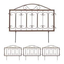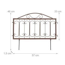 Mit dieser dekorativen Beeteinfassung gestaltest und verschönerst Du Deinen Garten schnell und einfach. Markiere die Übergänge zwischen Beeten, Grünflächen, Wegen und Rabatten mit dem niedrigen Zierzaun. Dazu werden die 4 Zaunelemente mit den Erdspießen einfach in den Boden gedrückt. Die braune Beetbegrenzung lässt sich je nach Bedarf flexibel anordnen. Mit seinem antiken Design samt geschwungenen Ornamenten wird der Steckzaun aus Eisen dabei sicher zum Hingucker in Deinem Außenbereich.