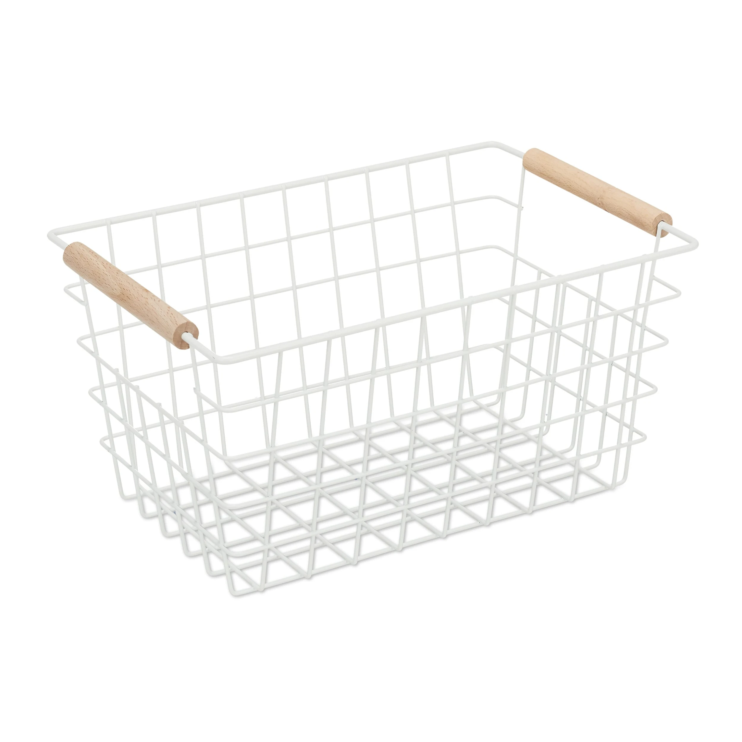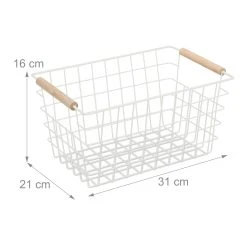 Der Metallkorb ist ein echter Aufbewahrungs-Allrounder und bietet stilvoll Stauraum für kleinere Gegenstände. Das Körbchen ist dank der 2 Holzgriffe einfach tragbar. Verstauen Sie Kosmetikartikel oder Kleidungsstücke wie Socken, Unterwäsche, Tücher und Accessoires platzsparend. Nutzen Sie den Korb im Badezimmer, im Kleiderschrank oder als Regalkorb. Das offene und zeitlos schlichte Gitter-Design verschafft Ihnen nicht nur schnell Überblick über den Inhalt, sondern ist auch ein echter Hingucker.