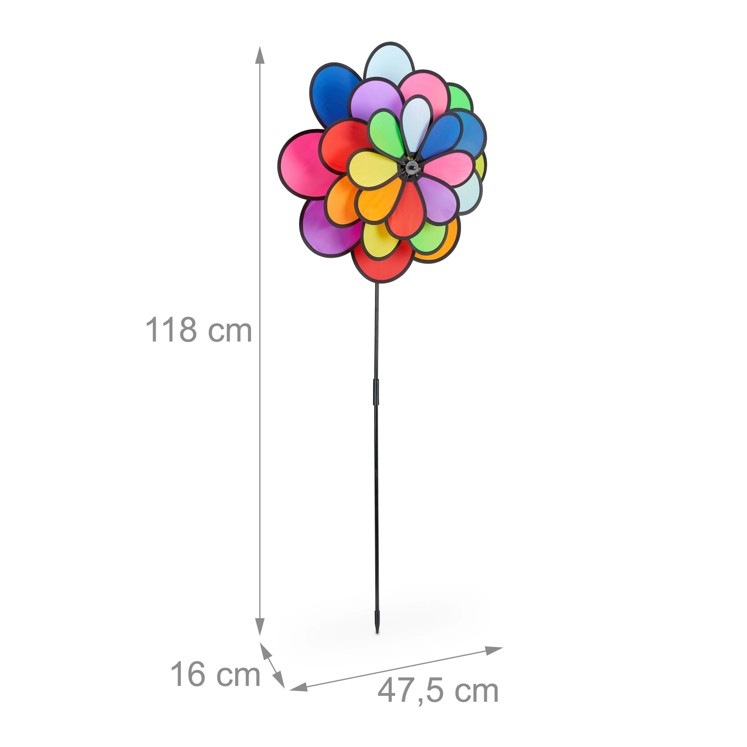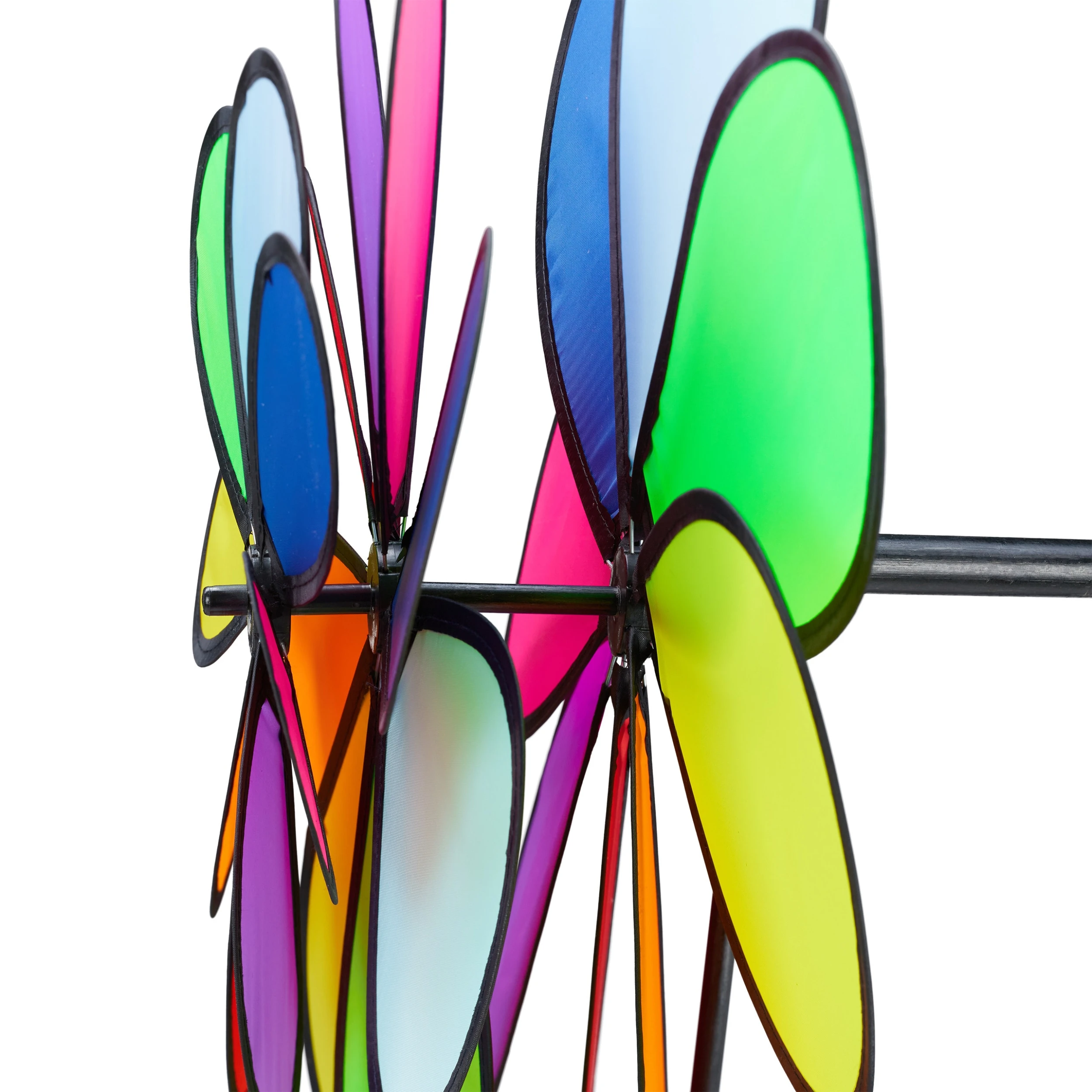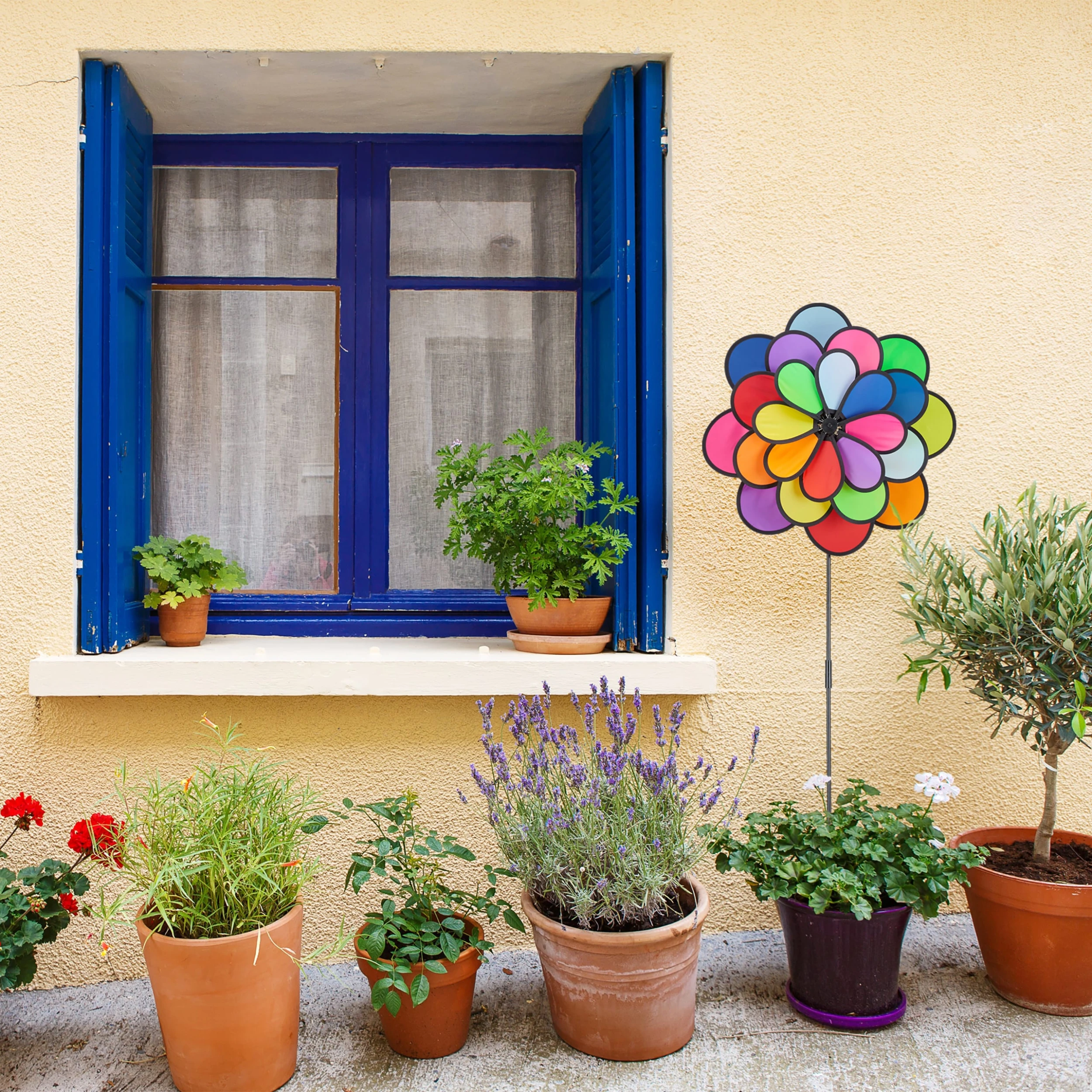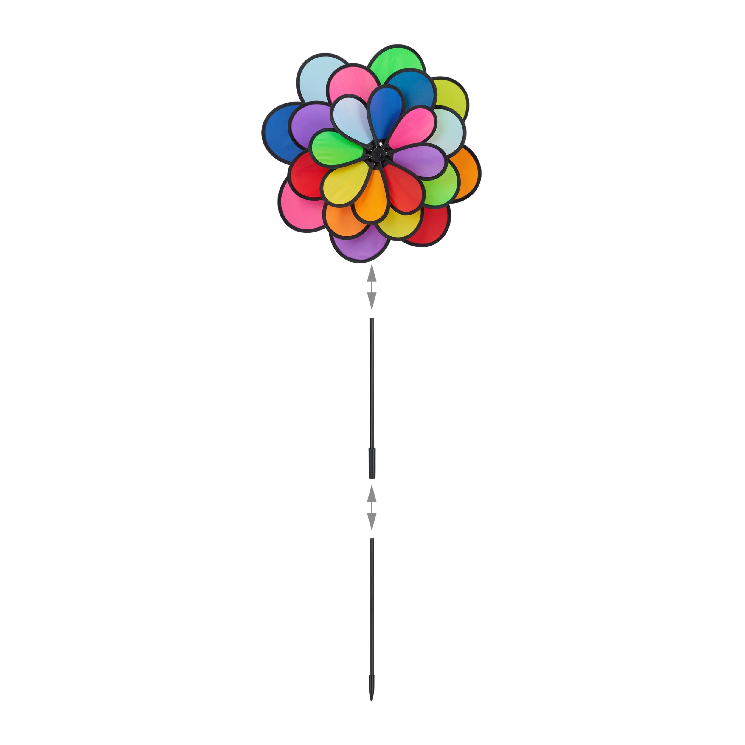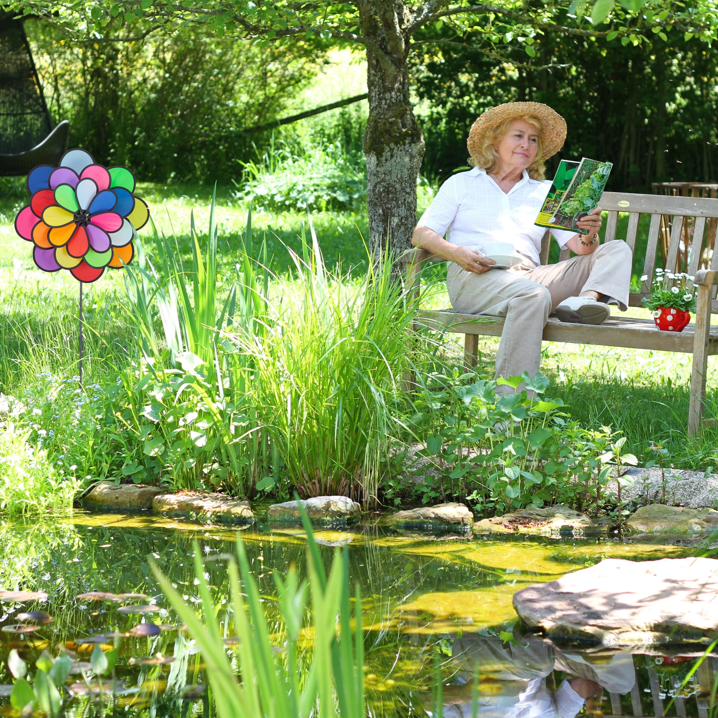 Bringen Sie mit diesem frühlingshaften Gartenstecker Farbe auf Ihren Balkon. Einfach zusammengesetzt und in einen Blumentopf gesteckt, ist das bunte Regenbogen Design ein echter Hingucker. Genießen Sie das prachtvolle Farbenspiel, wenn das Windrad von wehenden Lüften angetrieben wird. An den optischen Eindrücken des Windspiels können sich sowohl Kinder als auch Erwachsene erfreuen. Platzieren Sie die Windmühle im Garten oder auf der Terrasse oder nehmen Sie sie mit zum Strand sowie zum Camping.