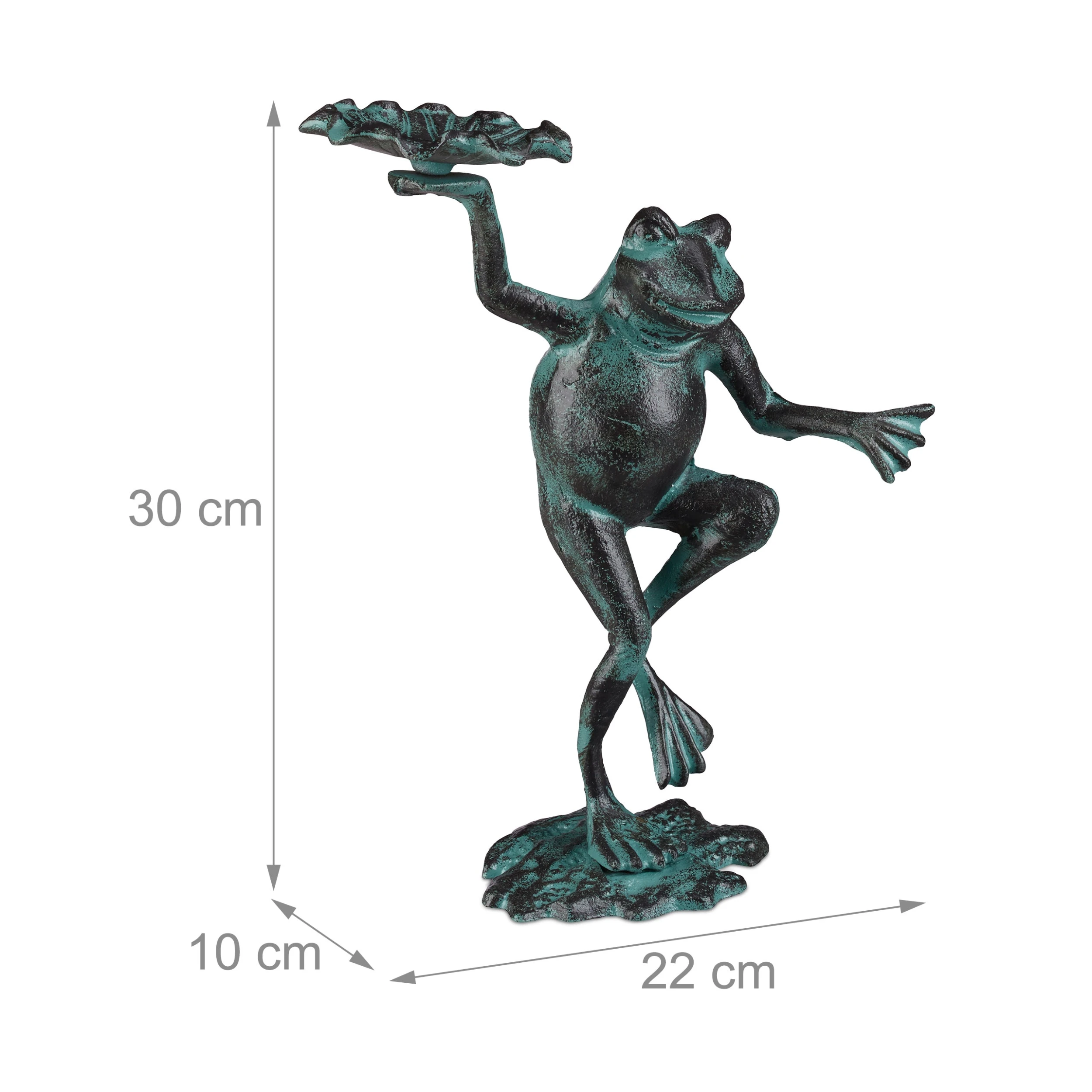 Sorgen sie mit dieser Tierfigur für ein lebendiges Flair in Ihrem Garten. Ob im Blumenbeet, neben dem Gartenteich oder auf dem Balkon – der Dekofrosch ist überall ein Blickfang. Dabei steht der Frosch in agiler Pose auf dem Standbein und sorgt mit seinem breiten Lächeln für gute Laune bei Ihnen. Verschenken Sie den Gartenfrosch auch an die Frosch-Liebhaber unter Ihren Freunden und Verwandten. Dank des pulverbeschichteten Materials und der schweren Qualität aus Gusseisen hält der Frosch Wind und Wetter draußen ganzjährig stand.