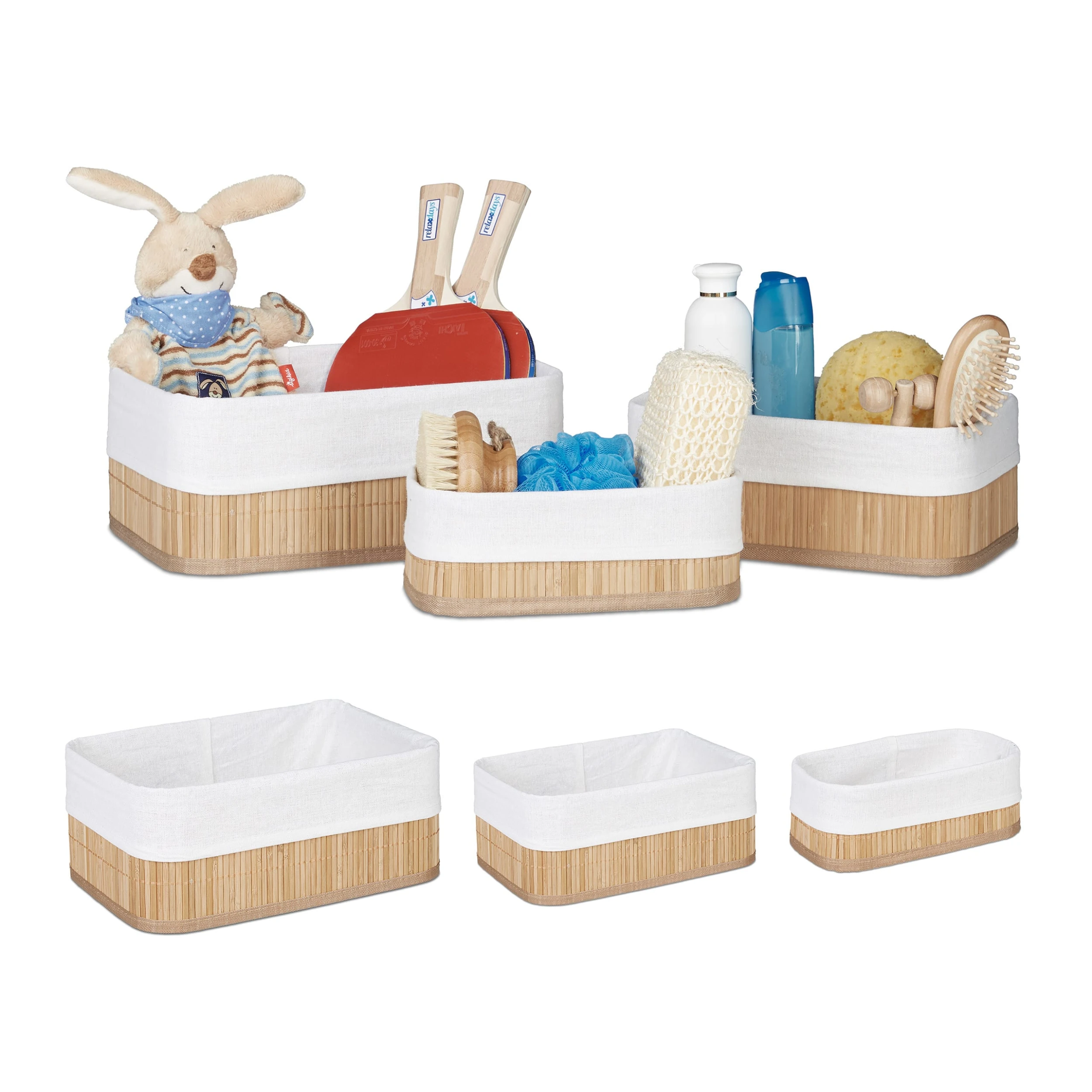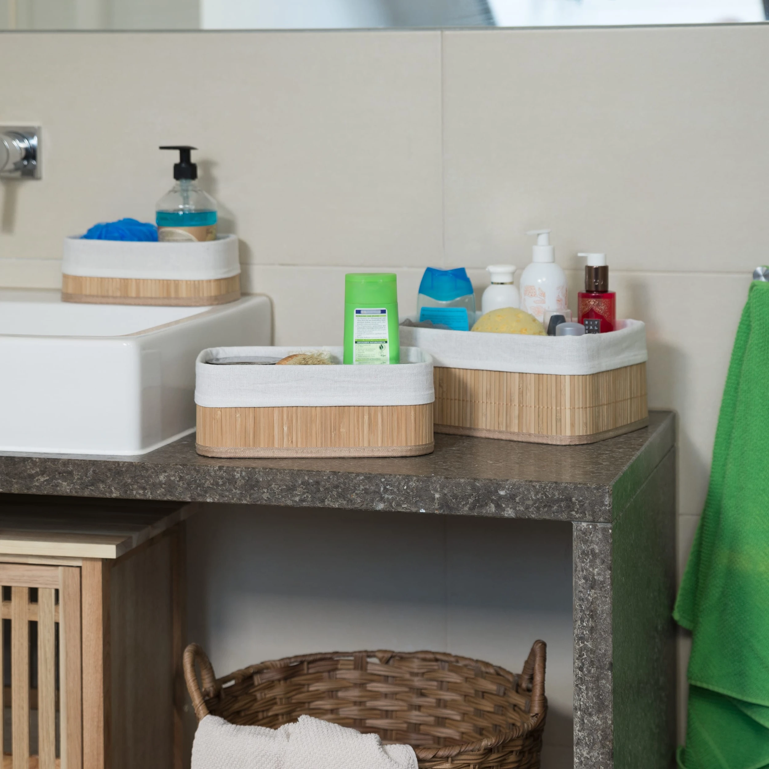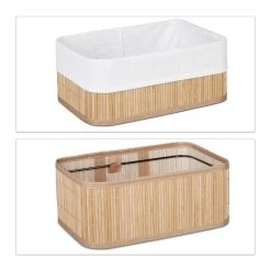 Wenn Badablage oder Wannenrand überfüllt sind, schafft der Aufbewahrungskorb fürs Badezimmer Ordnung. Der feuchtigkeitsabsorbierende Bambuskorb ist nicht nur für das Bad geeignet. Im ganzen Haus halten die Aufbewahrungsboxen die Dinge des Alltags übersichtlich an ihrem Platz. Die praktischen Dekokörbe zieren Kinder-, Schlaf- oder Wohnzimmer. Verwenden Sie das Set als Regalkorb oder Schrankbox für Socken, Accessoires und andere Kleinteile.