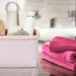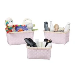 Dank der Aufbewahrungskörbe im 3er Set schaffen Sie auf dekorative Weise Ordnung in den verschiedensten Räumen. Die Körbe aus Kunststoff sind robust, pflegeleicht und durch ihr geflochtenes Design zeitlos schön. Das verspielte Rosa ergänzt sich prima mit der natürlichen Optik der Bambus-Elemente. Dank der Körbchen verstauen Sie Spielzeug, Bad- oder Kosmetikprodukte platzsparend. Die kleineren Badkörbe können passgenau in den größten Aufbewahrungskorb gestellt werden.