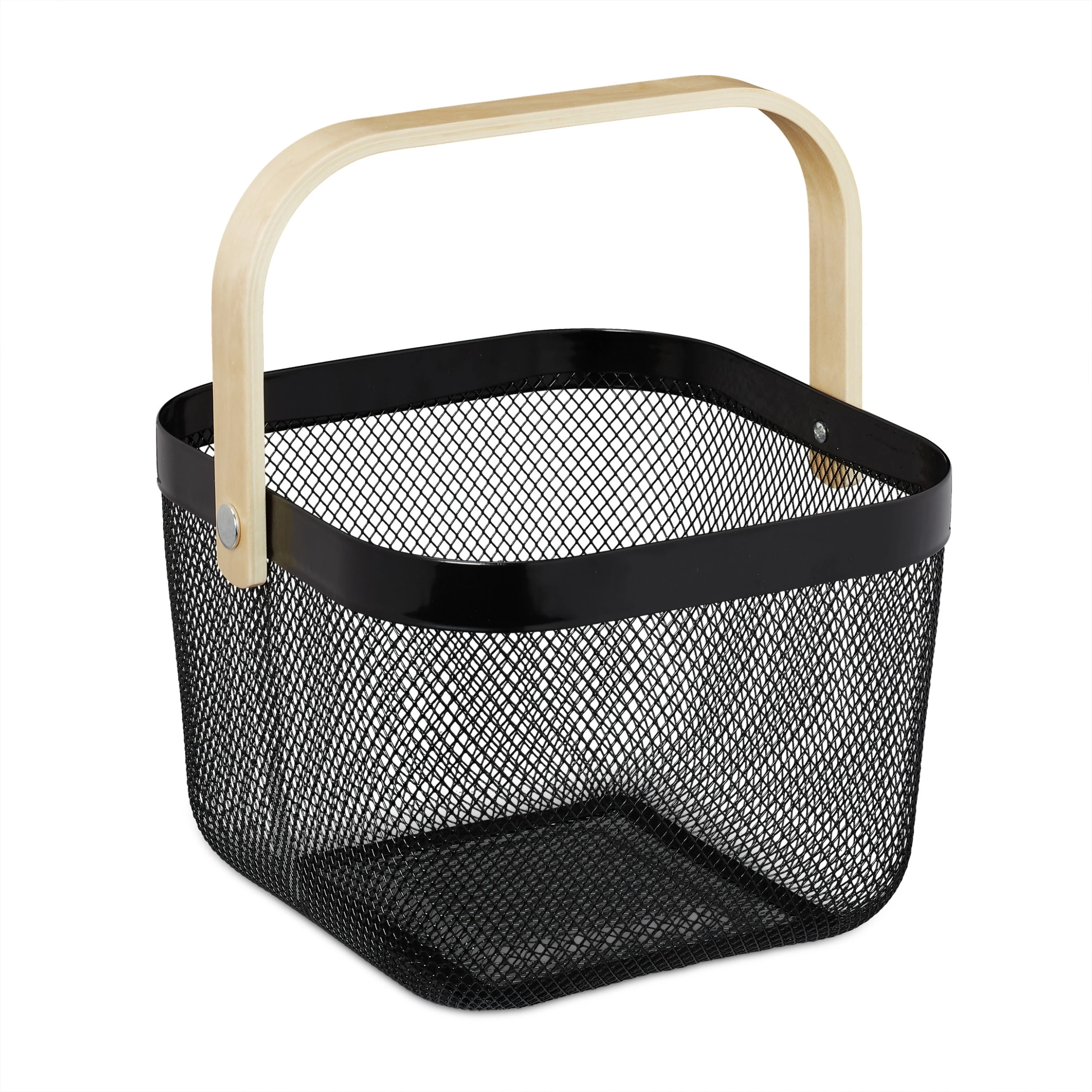 Der Metallkorb ist ein echter Aufbewahrungs-Allrounder und bietet Stauraum für kleinere Gegenstände. Das eckige Körbchen passt in jeden Raum und jedes Regal. Verstauen Sie Kosmetikartikel oder Kleidungsstücke wie Socken, Unterwäsche und Accessoires platzsparend. Nutzen Sie den Drahtkorb auch für Deko oder neben dem Schreibtisch für Büroutensilien. In der Küche bringt der Korb Ordnung in Ihre verpackten Vorräte. Der Mix aus Metall und Holz macht den Gitterkorb auch optisch zu einem Blickfang.