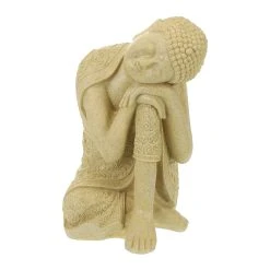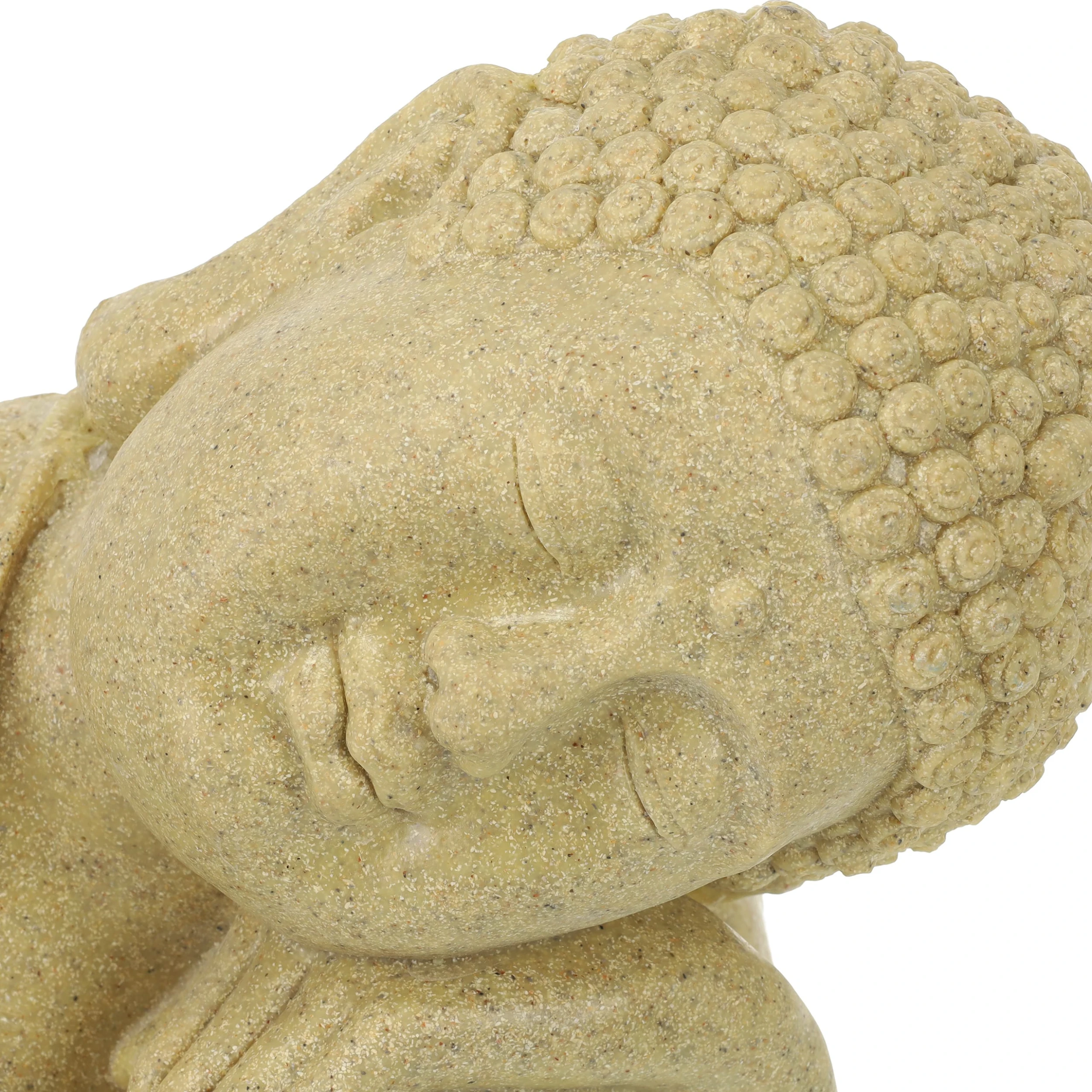 Die große Statue zeigt einen ruhenden Buddha mit geneigtem Kopf und einem liebevoll verziertem Gewand – ein Talisman für Glück und Erkenntnis. Die spirituelle Dekofigur verschönert Balkon, Terrasse und Garten und macht sie zu Ihrem persönlichem Wohlfühlort. Aus hochwertigem Polyresin ist die Buddha Figur, dank ihrer wetterfesten und frostsicheren Eigenschaften, bestens zur Outdoor-Nutzung geeignet. Aber auch im Wohnzimmer oder im Bad ist die Skulptur ein Blickfang, der Ruhe und Kraft ausstrahlt.
