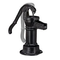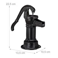 Mit der Deko Pumpe im Mini-Format bereichern Sie Ihren Garten um einen Hingucker im antiken Design. Die Gartendekoration ist einer klassischen Schwengelpumpe nachempfunden und ganz in Schwarz gehalten. Da die Wasserpumpe aus Gusseisen gefertigt ist, punktet sie mit einer rustikalen Optik, die sie älter erscheinen lässt. Auch wenn die Gartenpumpe für dekorative Zwecke gedacht ist, lässt sich ihr Schwengel bewegen – dazu brauchen Sie lediglich die Schraube zu lockern. An Bohrlöcher für eine zuverlässige Verankerung im Boden ist bereits gedacht.