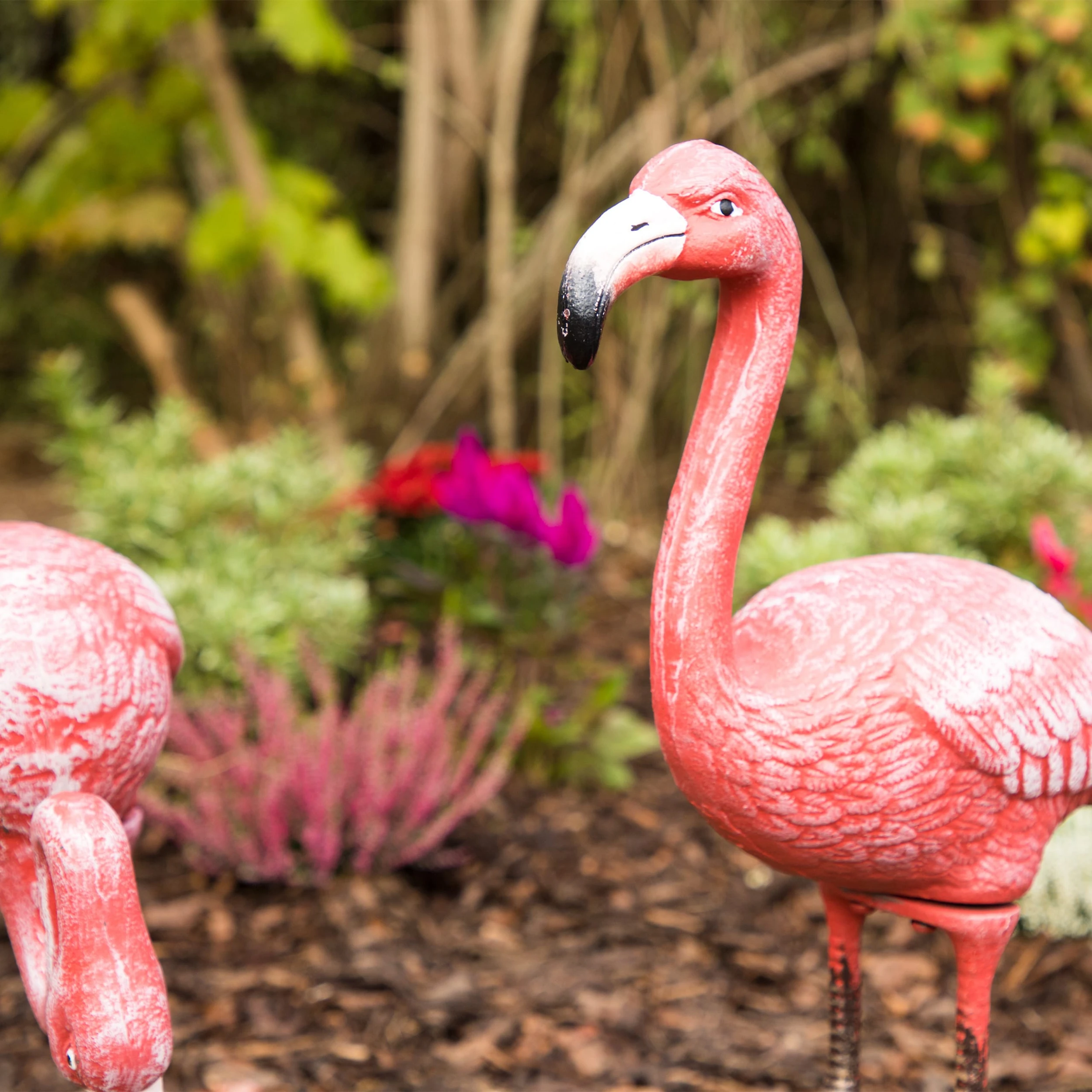 Der Flamingo ist komplett aus Gusseisen gefertigt und kann ganzjährig Draußen aufgestellt bleiben, da er wetterfest und frostbeständig ist. Durch den runden Standfuß steht die Dekoskulptur stabil und muss nicht extra am Boden befestigt werden. Nach einiger Zeit im Freien verblasst die Farbe und verwandelt sich in einen wunderbaren Patina-Effekt.