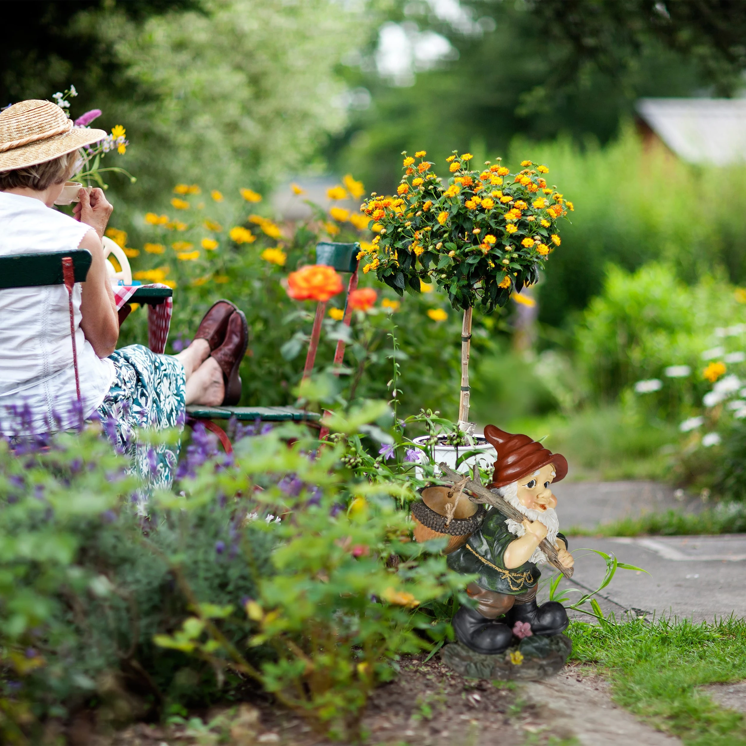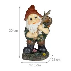 Er ist der Klassiker in jedem Garten und kommt einfach nicht aus der Mode – Der Gartenzwerg! Das kleine Männchen mit roter Zipfelmütze, weißem Bart und schwarzen Stiefelchen sorgt für einen tollen Blickfang im Garten oder dem Vorgarten. Besonders putzig ist das kleine Eichelkörbchen auf dem Rücken, das der Zwerg an einem Stock trägt. Doch auch weitere schöne Details, wie die kleinen bunten Blümchen auf dem Standfuß und die roten Wangen fallen dem Betrachter ins Auge.