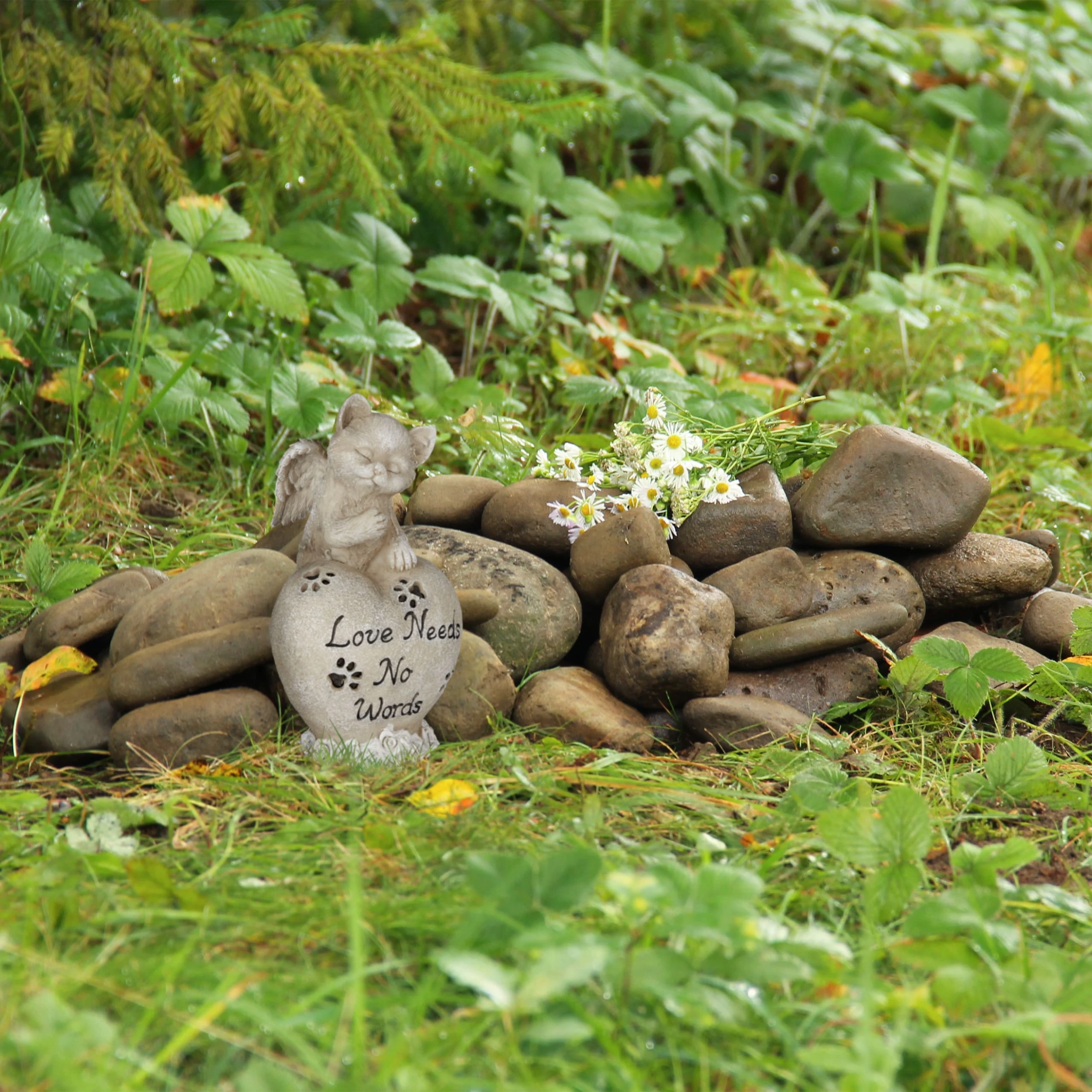 Der Schmerz sitzt tief, wenn ein geliebtes Tier plötzlich aus dem Leben gerissen wird oder ein jahrelanger Begleiter seine letzte Reise antritt. Das Haustier gehörte fest zur Familie und soll richtig gewürdigt werden. Ein schöner Ort für das Grab, ob im eigenen Garten oder auf einem Tierfriedhof, benötigt ein kleines Denkmal, dass die Stelle markiert. Bei diesem Andenken mit Herz und süßem Katzenengel treffen Sie die richtige Wahl. Ein Spruch und Pfotenabdrucke runden den Grabschmuck ab.