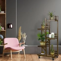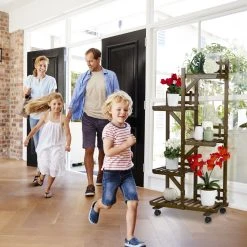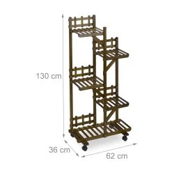 Wenn Du einen großen Wohnbereich, eine ungenutzte Nische oder bodentiefe Fenster ohne Fensterbrett hast, dann ist das Bambus Pflanzenregal die ideale Deko-Lösung für Dein Zuhause. Auf den 5 Ebenen des Pflanzenständers finden kleinere und größere Blumen ihren perfekten Platz. Der braune Farbton des Blumentopfständers harmoniert dabei gut mit dem satten Grün Deiner Zimmerpflanzen. Ja nach Lust und Laune kannst Du die Blumentreppe dank der 4 Rollen sogar an eine andere Stelle verschieben.