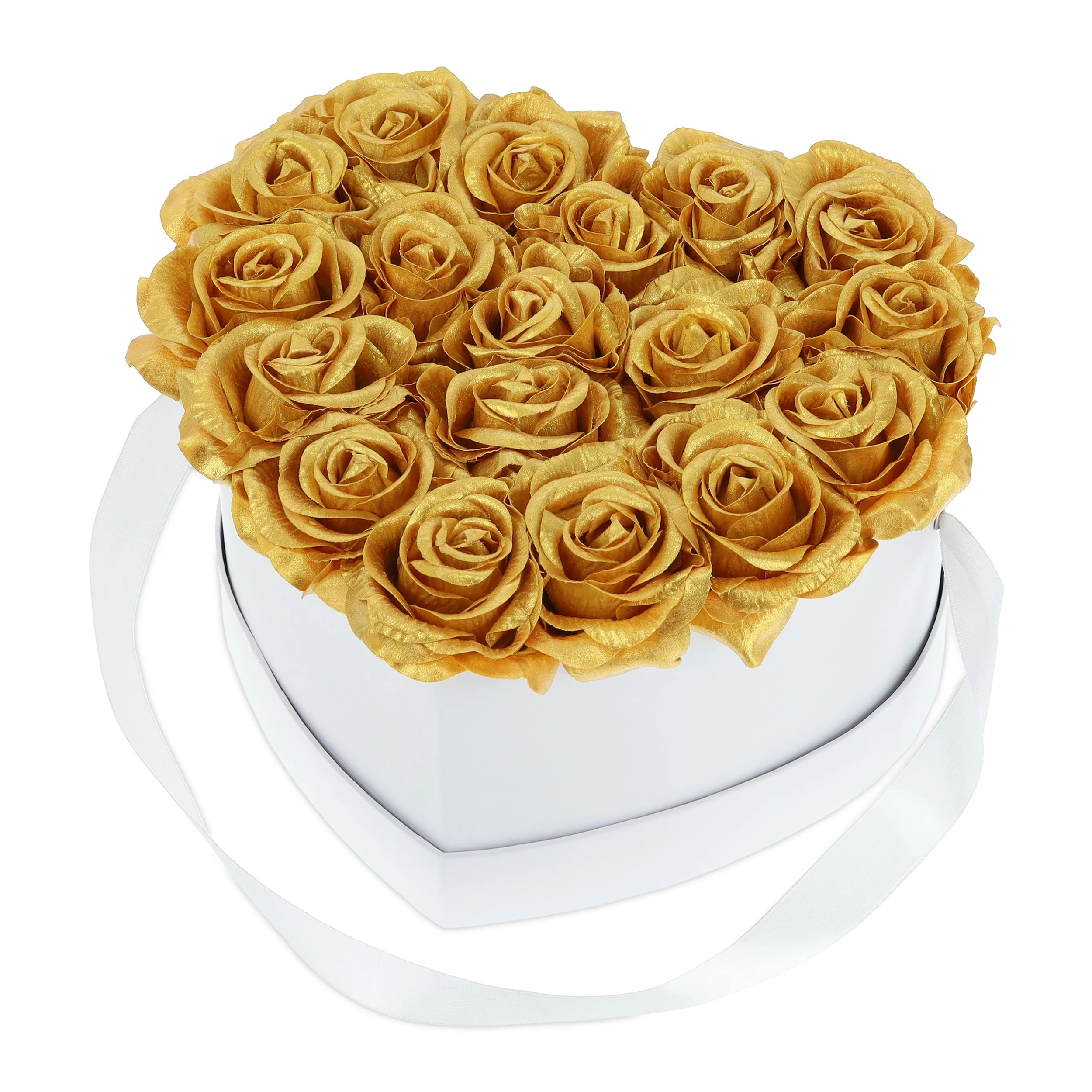 Die elegante Flowerbox ist die moderne Form des klassischen Rosenstraußes, mit der Du jeden Tag den Anblick hübscher Blüten genießen kannst. Harmonisch kombiniert mit der weißen Geschenkbox sind die 18 täuschend echten Kunstrosen ein stilvoller Eyecatcher in Deinem Zuhause. Ob als Hochzeits- oder Tischdeko, romantische Geste zum Valentinstag oder exklusives Geschenk zum Geburtstag – das in liebevoller Handarbeit gefertigte Rosenbouquet bietet Dir und Deinen Liebsten jahrelange Freude.