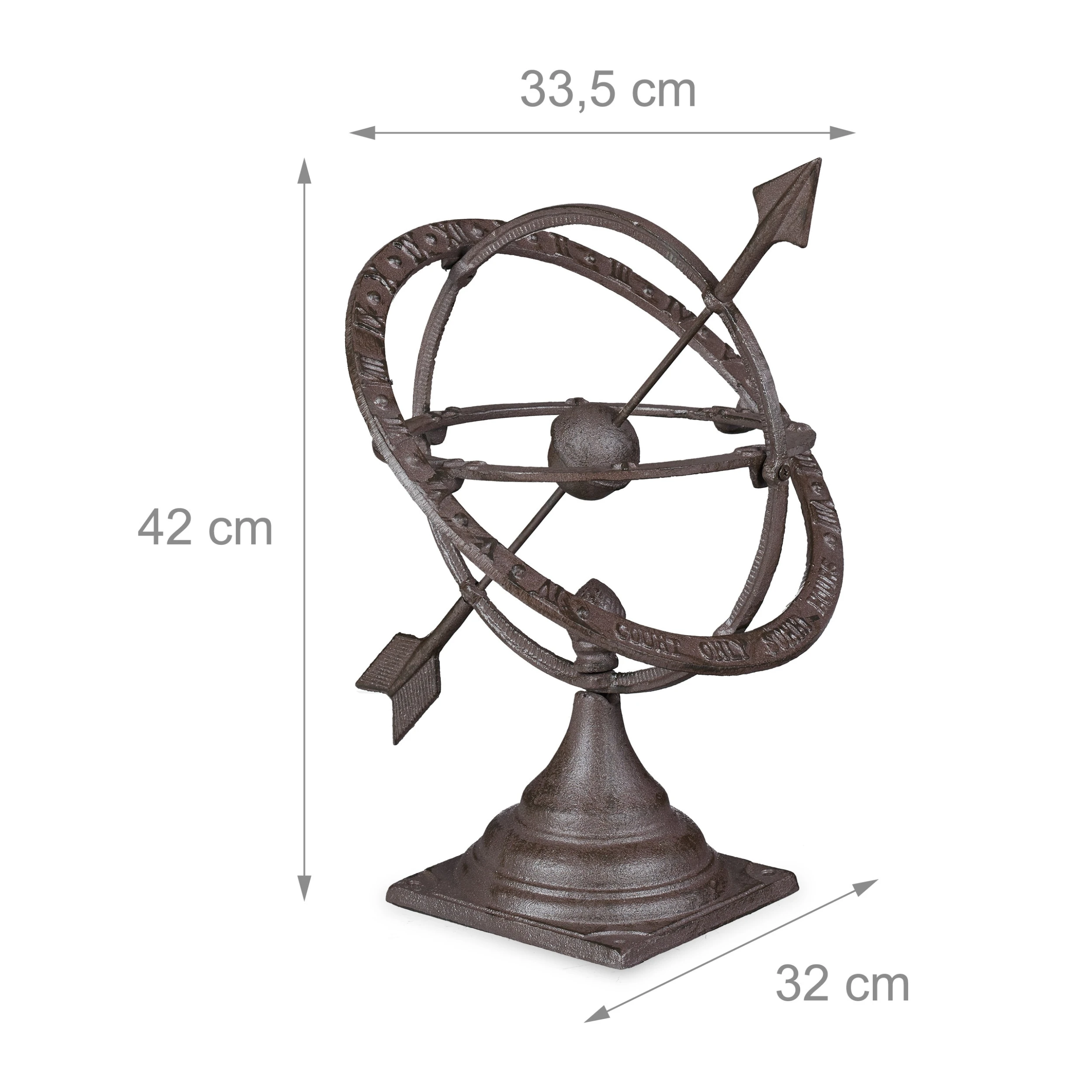 Machen Sie einen Ausflug in die Vergangenheit mit dieser dekorativen Sonnenuhr im antiken Design. Die Gartendekoration besteht komplett aus Gusseisen und hat einen Sockel mit Löchern für die Bodenmontage. Der Edelrost der Oberfläche verleiht der Deko Sonnenuhr ein uriges Erscheinungsbild, das wunderbar zum Garten passt. Die Gartendeko punktet mit einigen ansprechenden Details, etwa mit den römischen Ziffern oder dem Schriftzug (“COUNT ONLY SUNNY HOURS”).