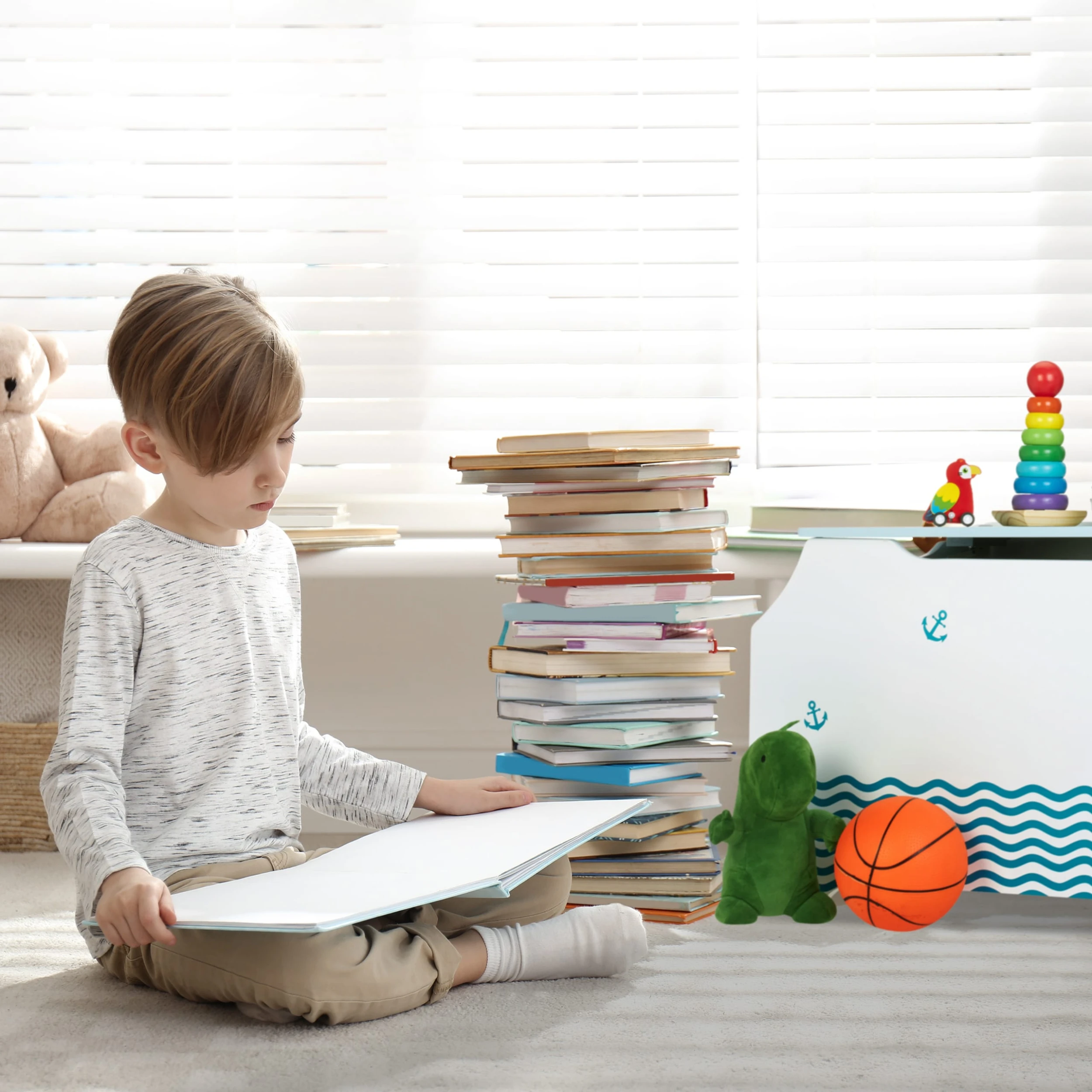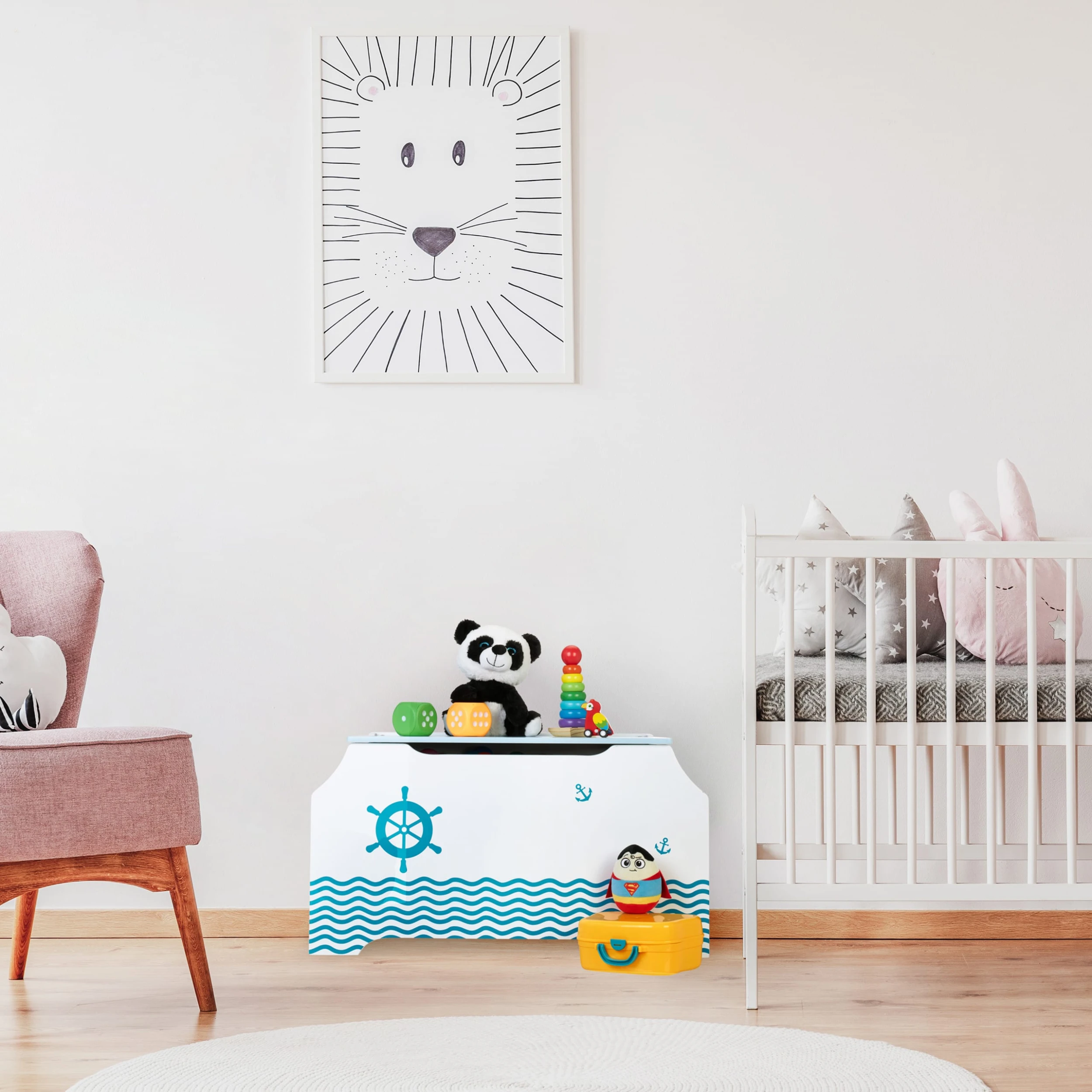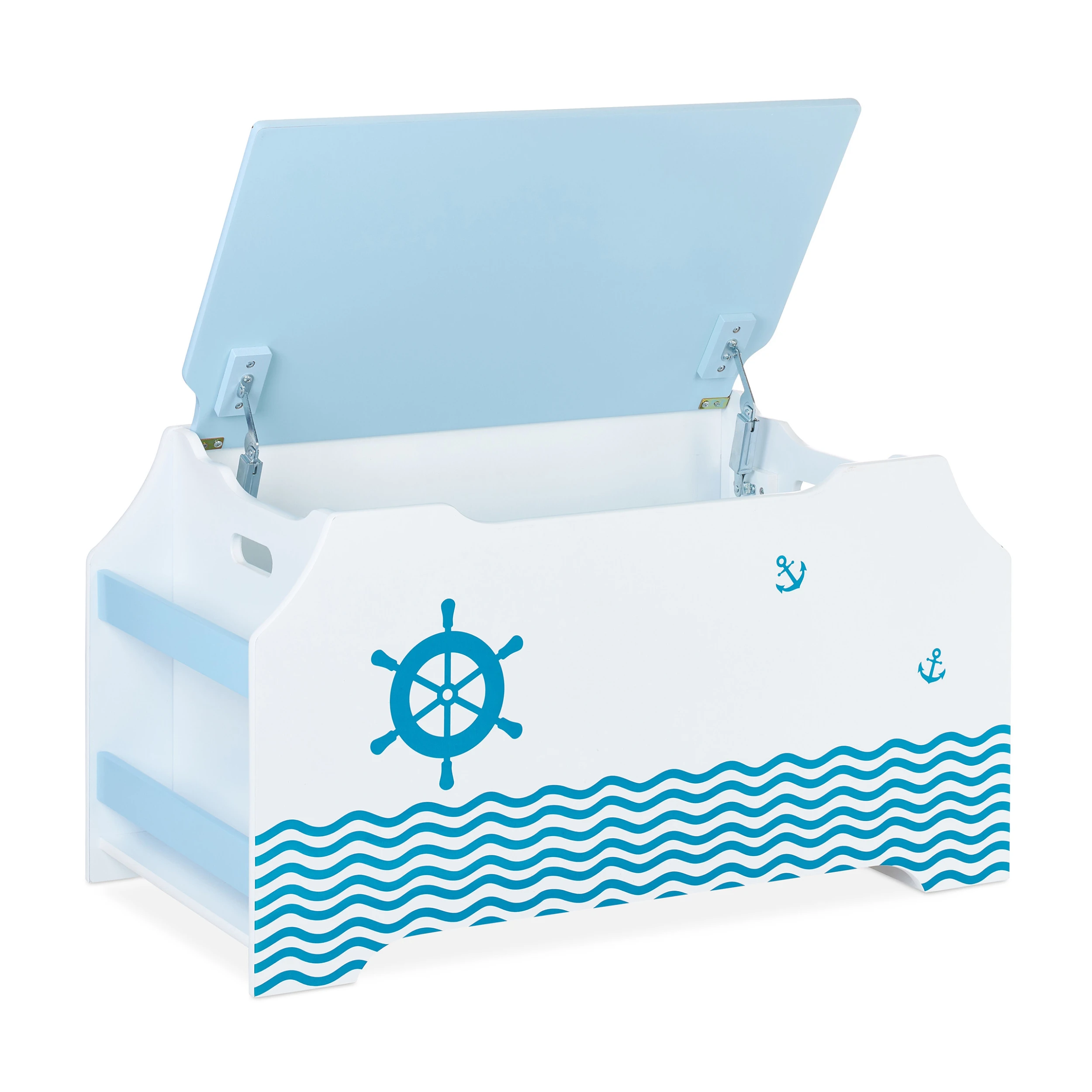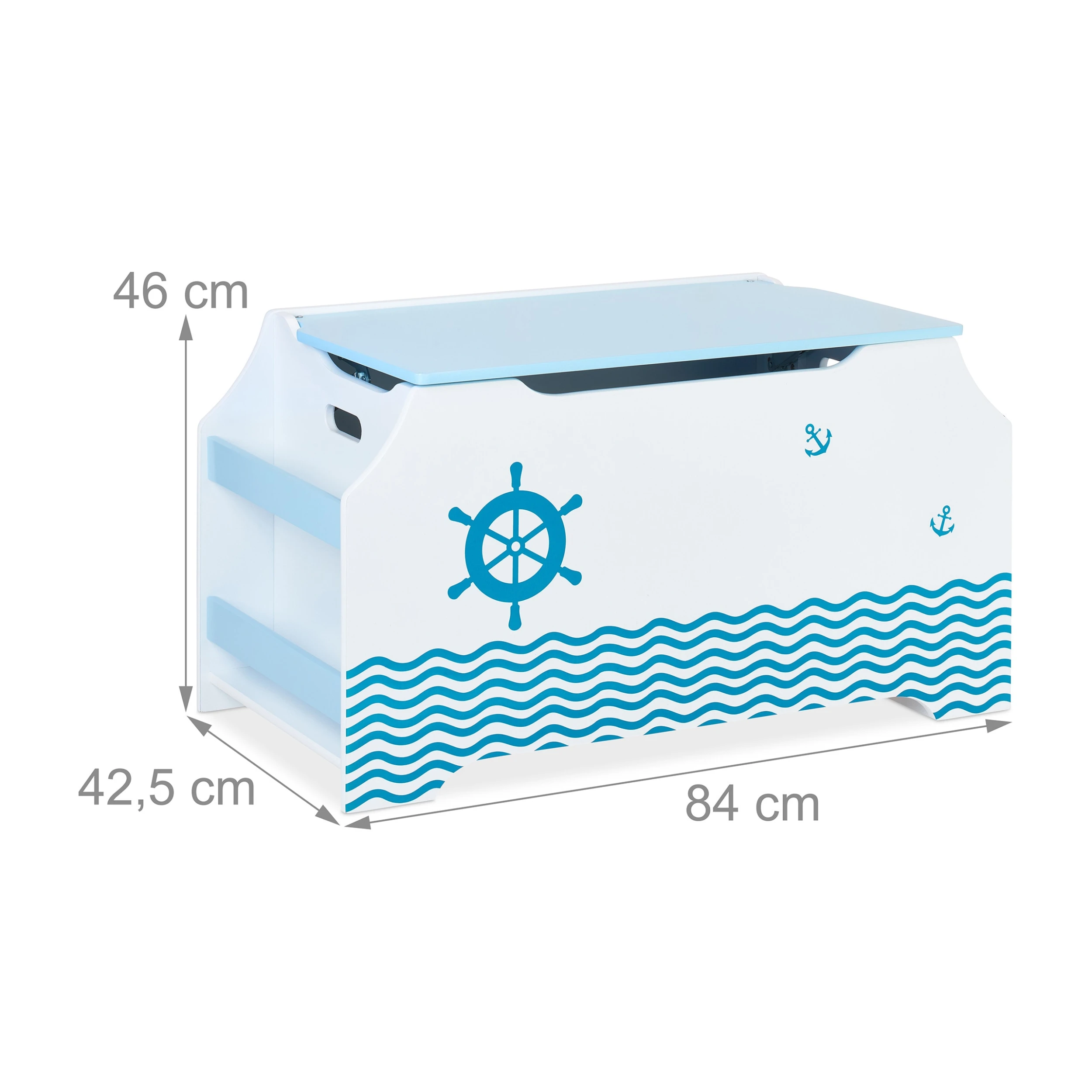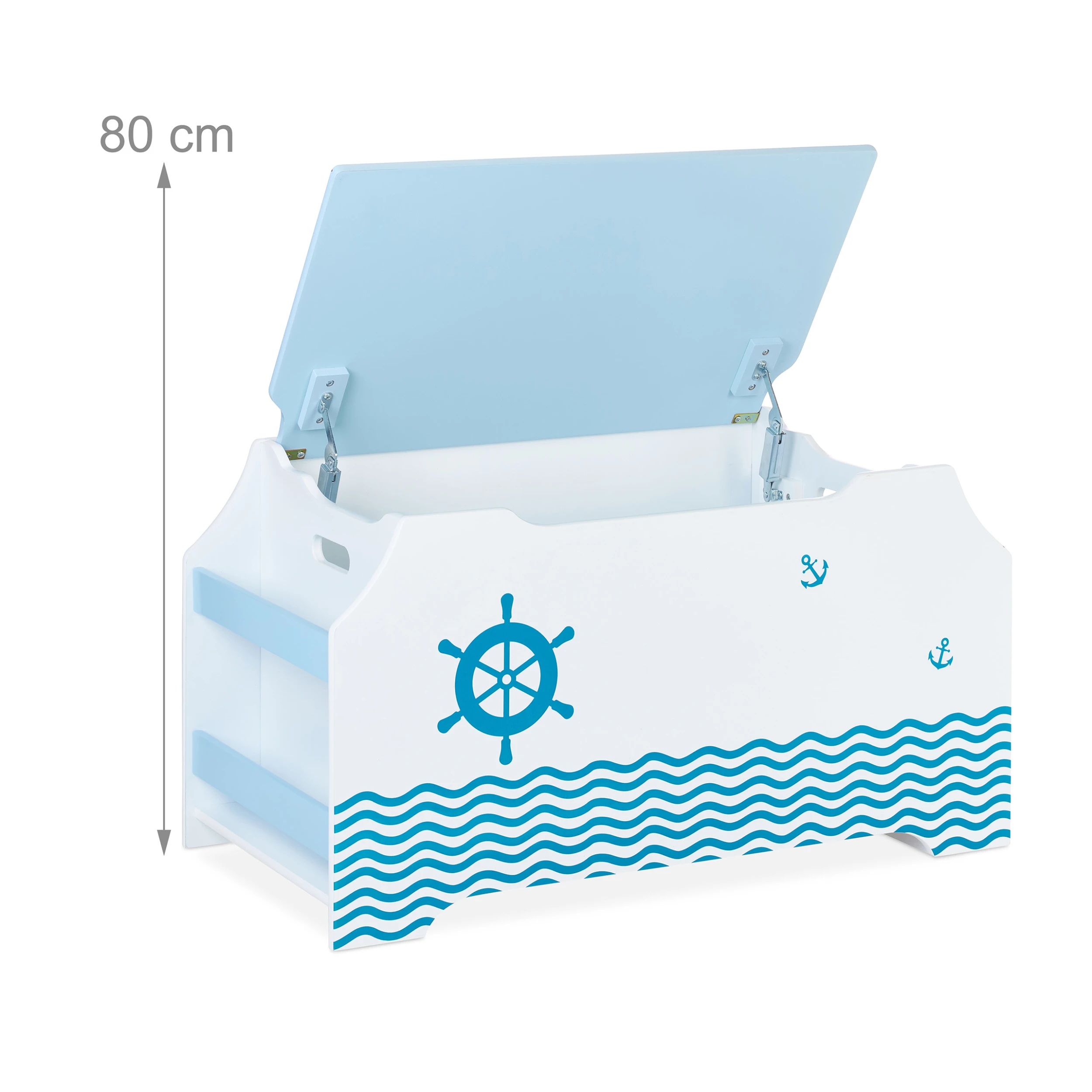 Nach ausgiebigem Toben und Spielen ist Unordnung im Kinderzimmer vorprogrammiert. Dank dieser Spielkiste ist das Chaos im Handumdrehen wieder beseitigt. Bausteine und andere Spielsachen sind im Spielzeugkasten blickgeschützt verstaut. Bücher lassen sich in den seitlichen Bücherfächern unterbringen. Der Deckel schließt extra sanft, sodass keine Gefahr für Kinderhände besteht. Das weiß-blaue Design mit coolem Seefahrt-Motiv macht die Aufbewahrungskiste zu einem schönen Blickfang im Kinderzimmer.