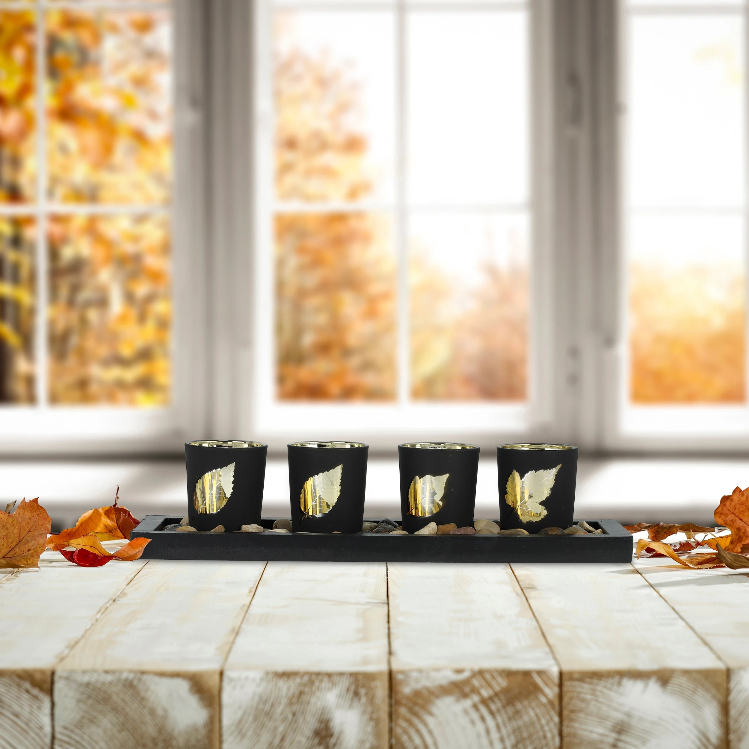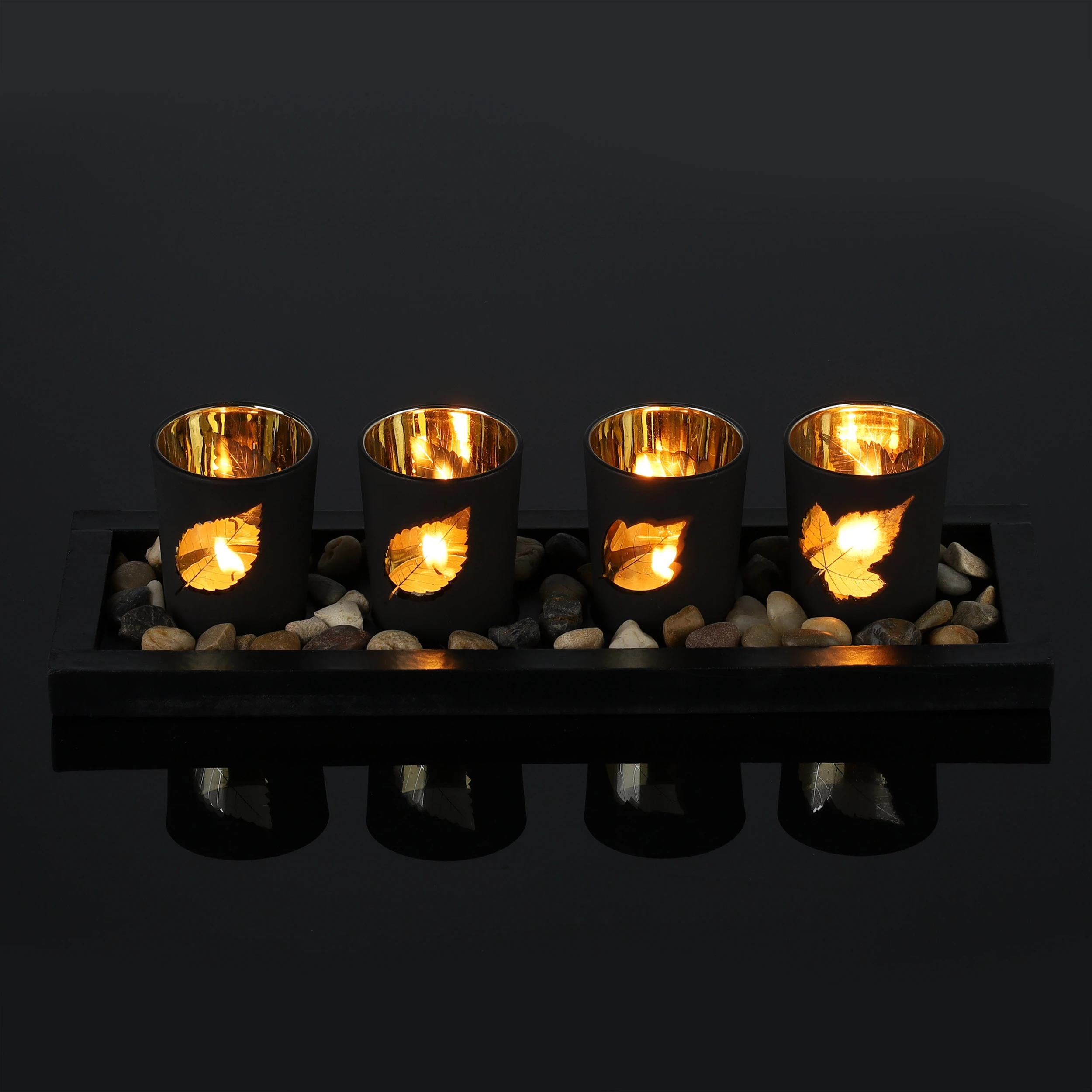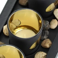Mit diesen stimmungsvollen Teelichtern holst Du Dir den Herbst in Dein Zuhause. Durch die Kombination von Schwarz und Gold wirkt die Kerzenschale optisch sehr stilvoll. Verziert werden die Teelichthalter zusätzlich noch von Blätter-Motiven. Neben seiner dekorativen Wirkung schafft der Teelichtständer eine sehr gemütliche und entspannte Atmosphäre. Das Kerzenset passt ideal in Dein Wohnzimmer, Bad uvm. Du kannst es auch dekorativ auf Deinem Esstisch oder Deiner Fensterbank platzieren.