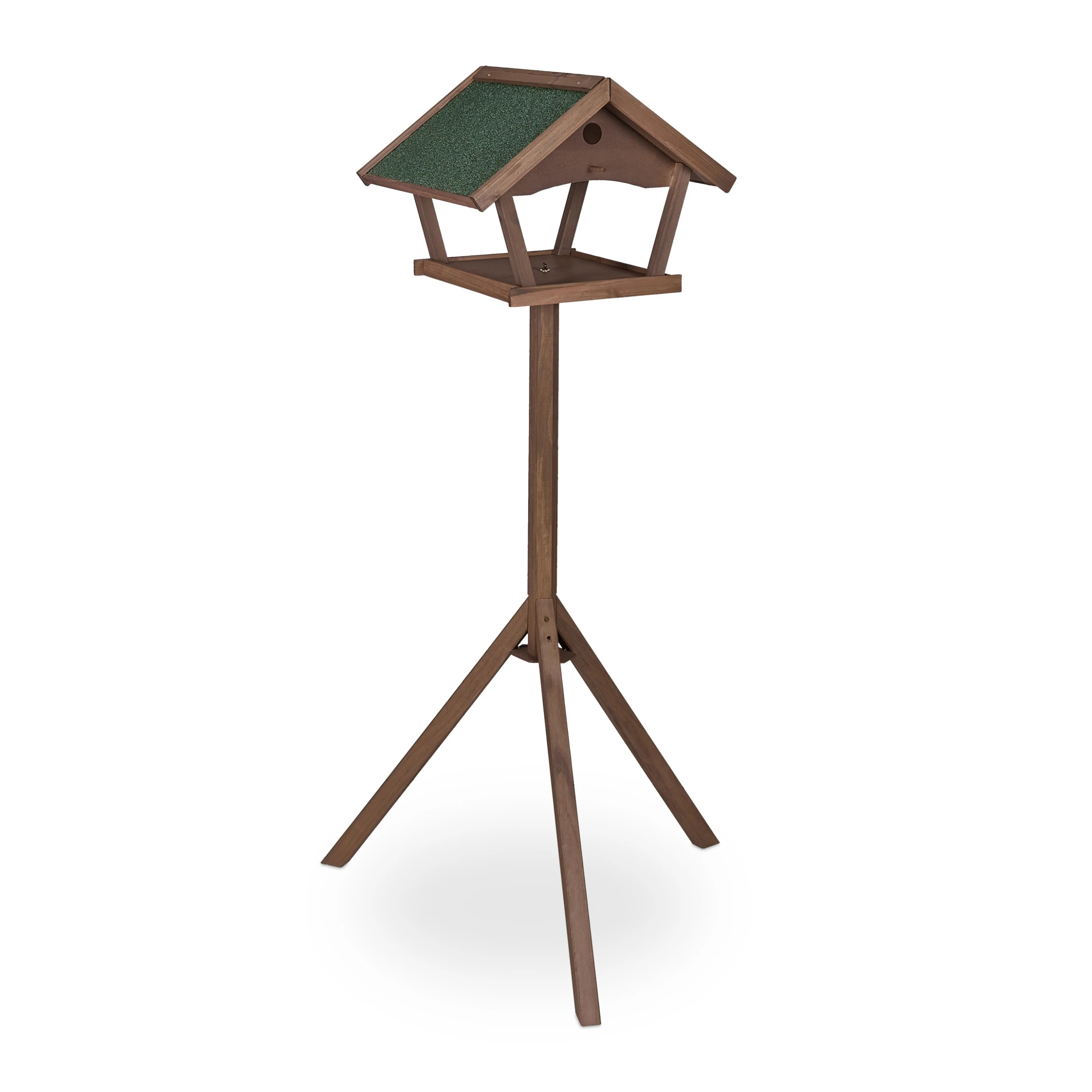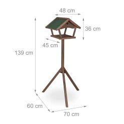 Das Futterhäuschen aus braunem Tannenholz kann auf der Terrasse oder im Garten dank seines Standfußes ganz einfach aufgestellt werden. Fülle ganzjährig Vogelfutter in die Futterstelle und locke damit heimische Vögel wie Meisen, Amseln und Rotkehlchen an. Die Vogelfutterstation ist eine tolle Beobachtungsmöglichkeit – besonders für Kinder. Das rustikale Design des Vogelhauses mit grünem Dach fügt sich dabei harmonisch in die Natur ein.
