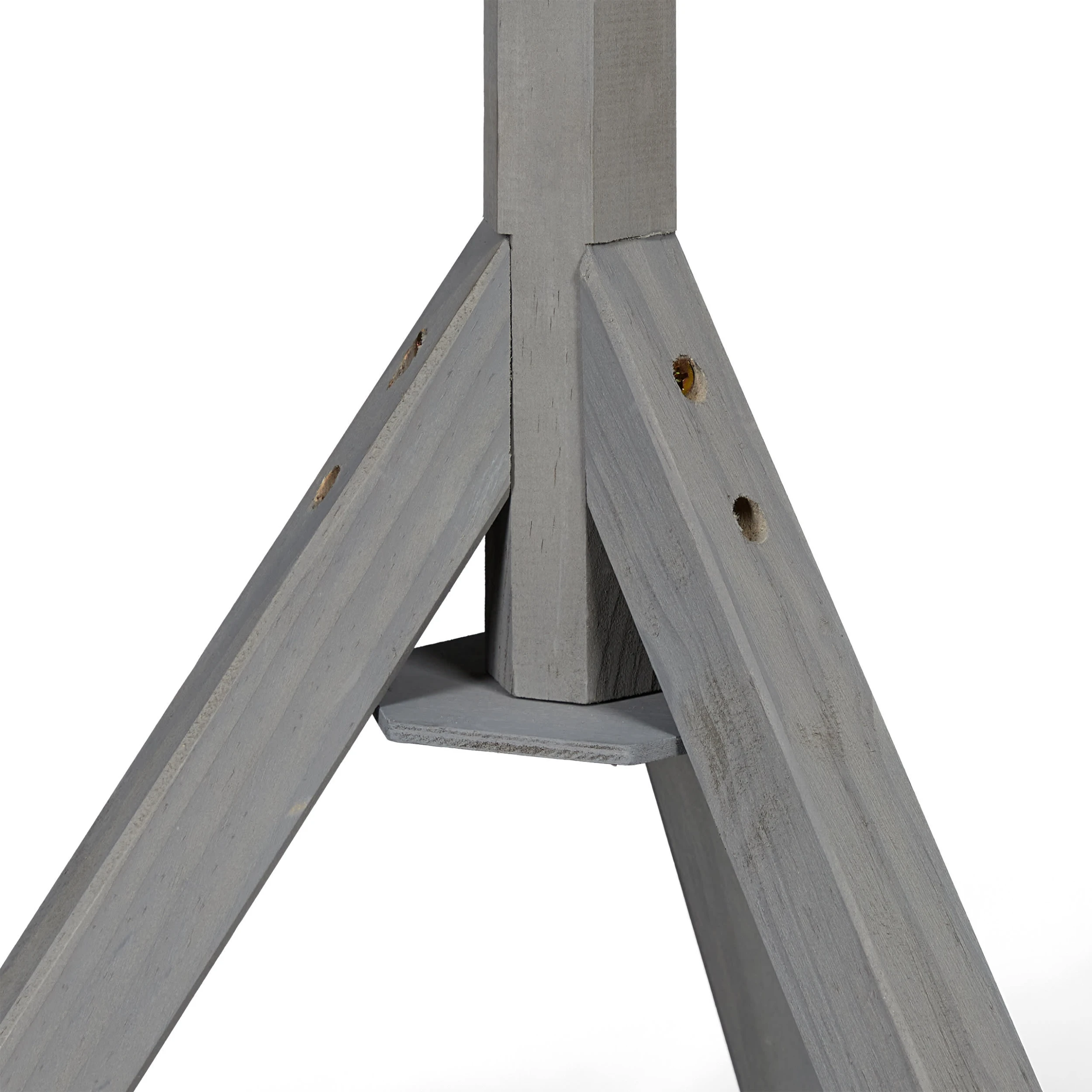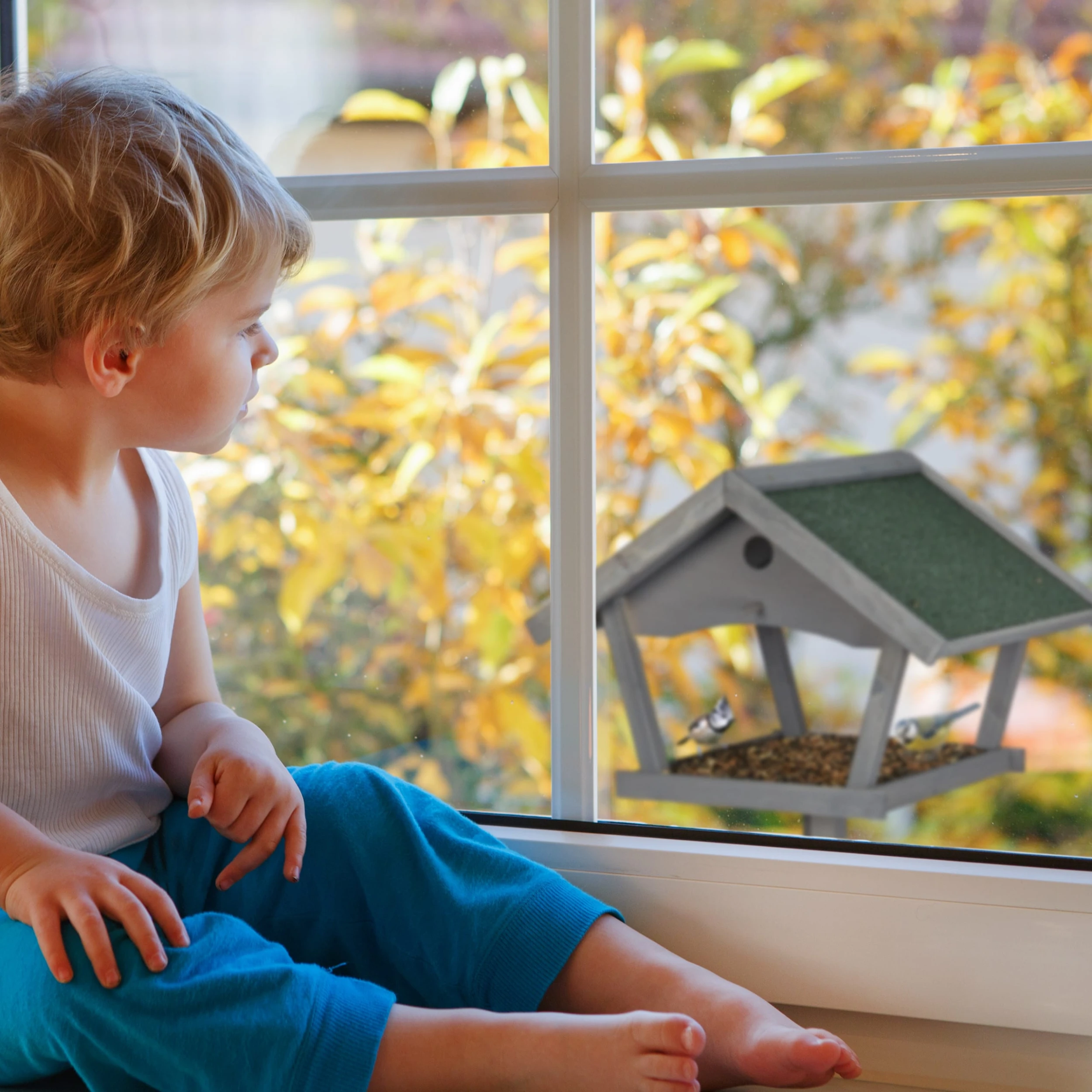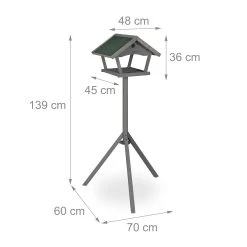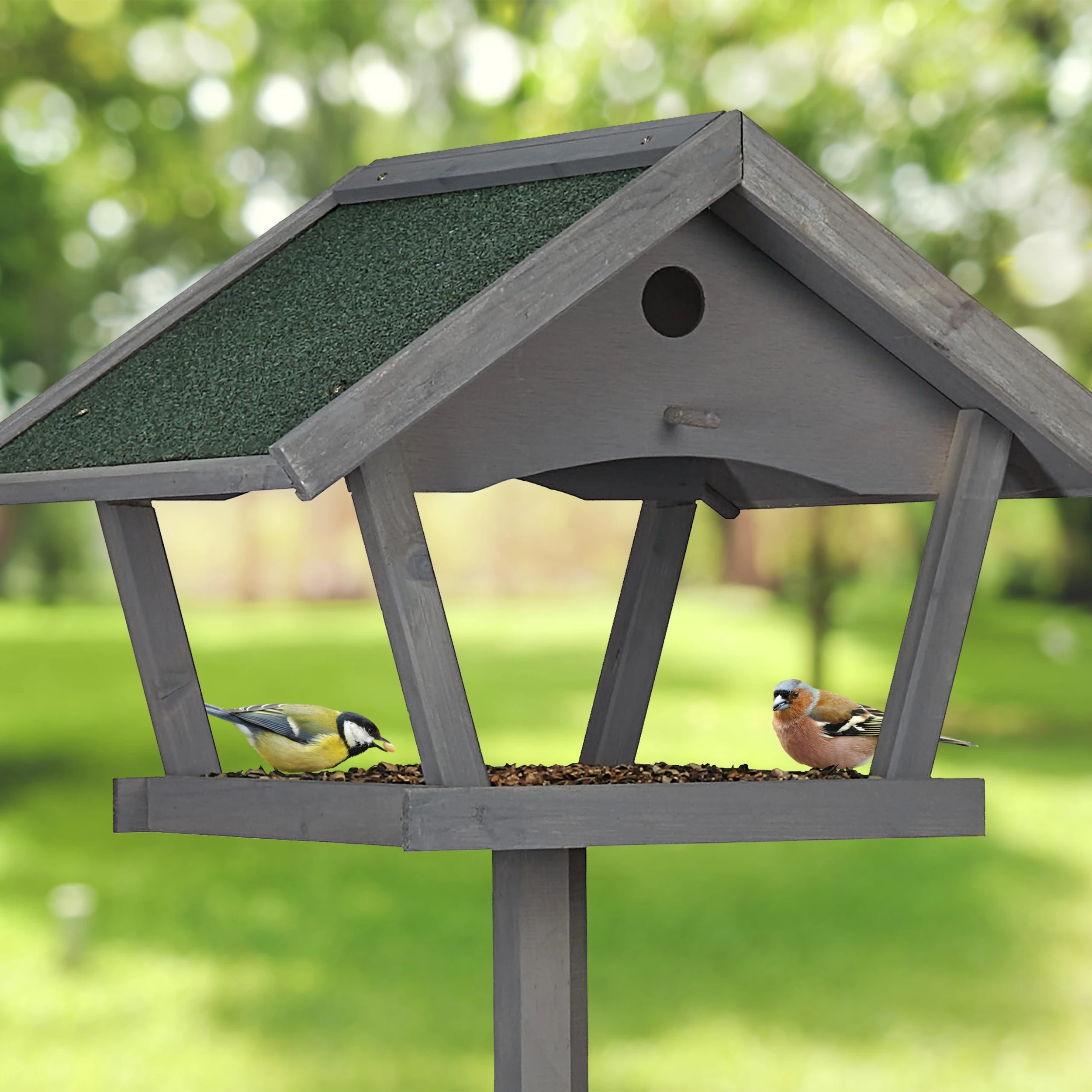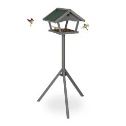 Das Futterhäuschen aus grauem Tannenholz kann auf Terrasse oder im Garten dank seines Standfußes ganz einfach aufgestellt werden. Fülle ganzjährig Vogelfutter in die Futterstelle und locke damit heimische Vögel wie Meisen, Amseln und Rotkehlchen an. Die Vogelfutterstation ist eine tolle Beobachtungsmöglichkeit – besonders für Kinder. Das rustikale Design des Vogelhauses mit grünem Dach fügt sich dabei harmonisch in die Natur ein.