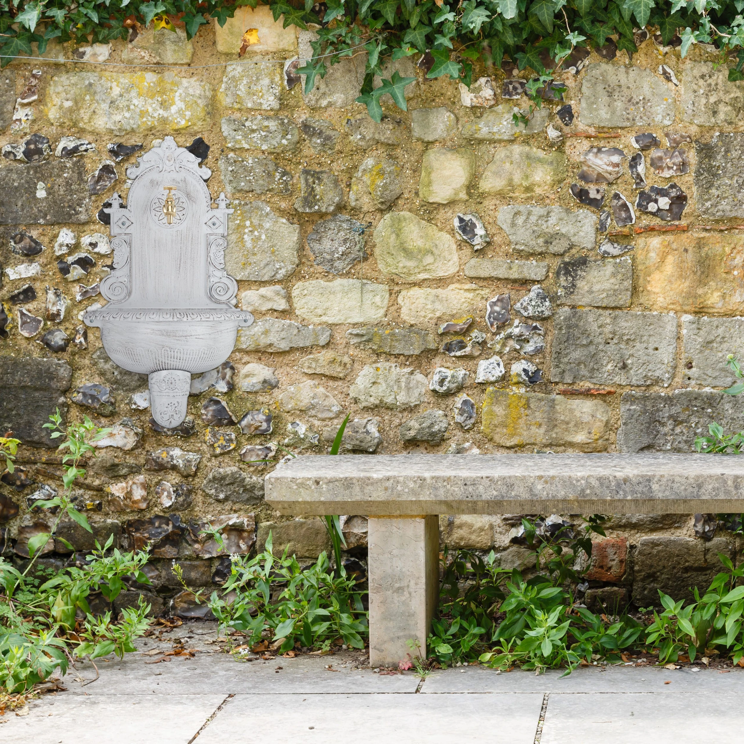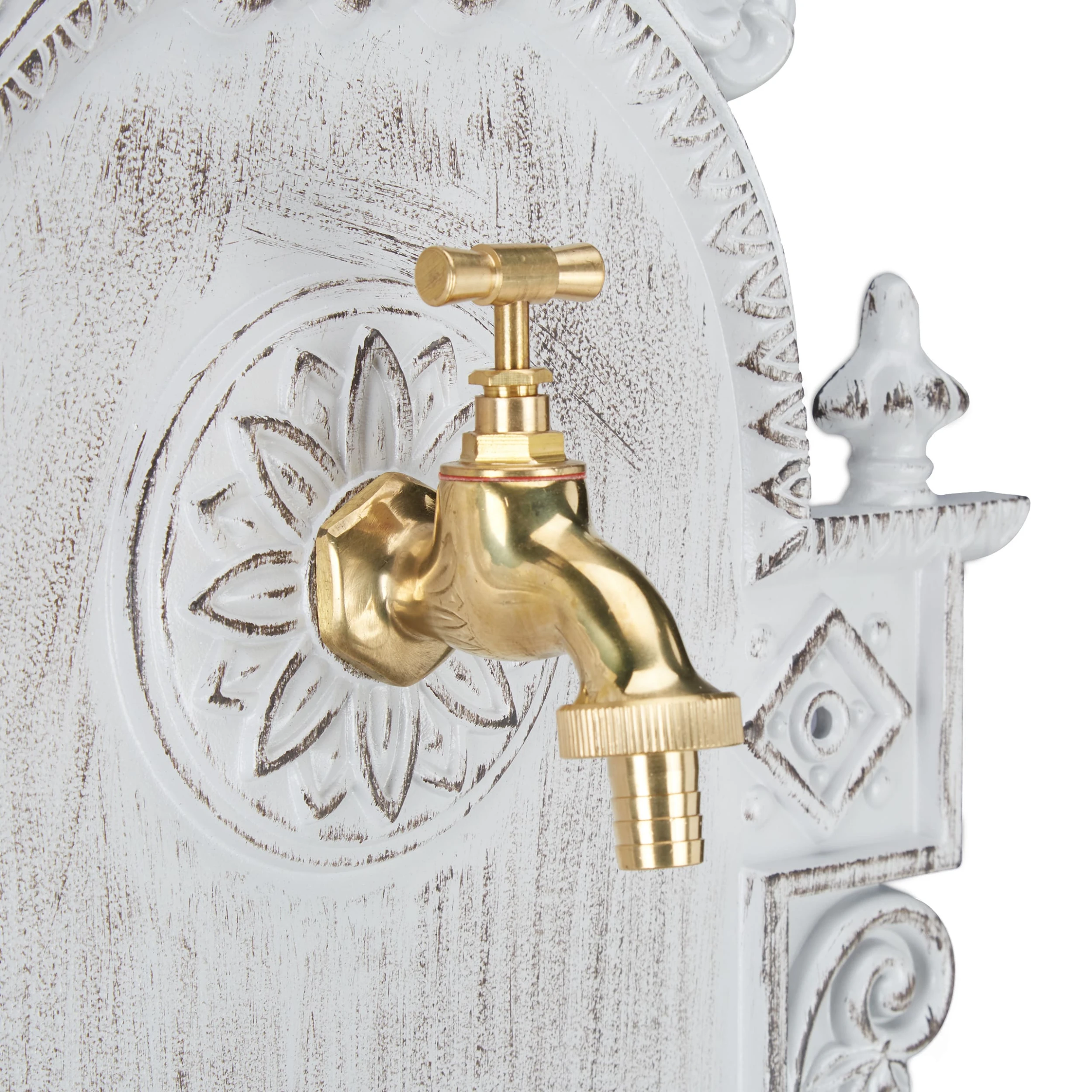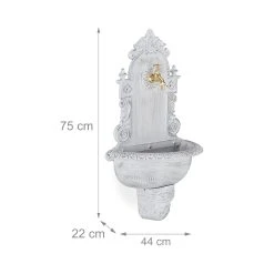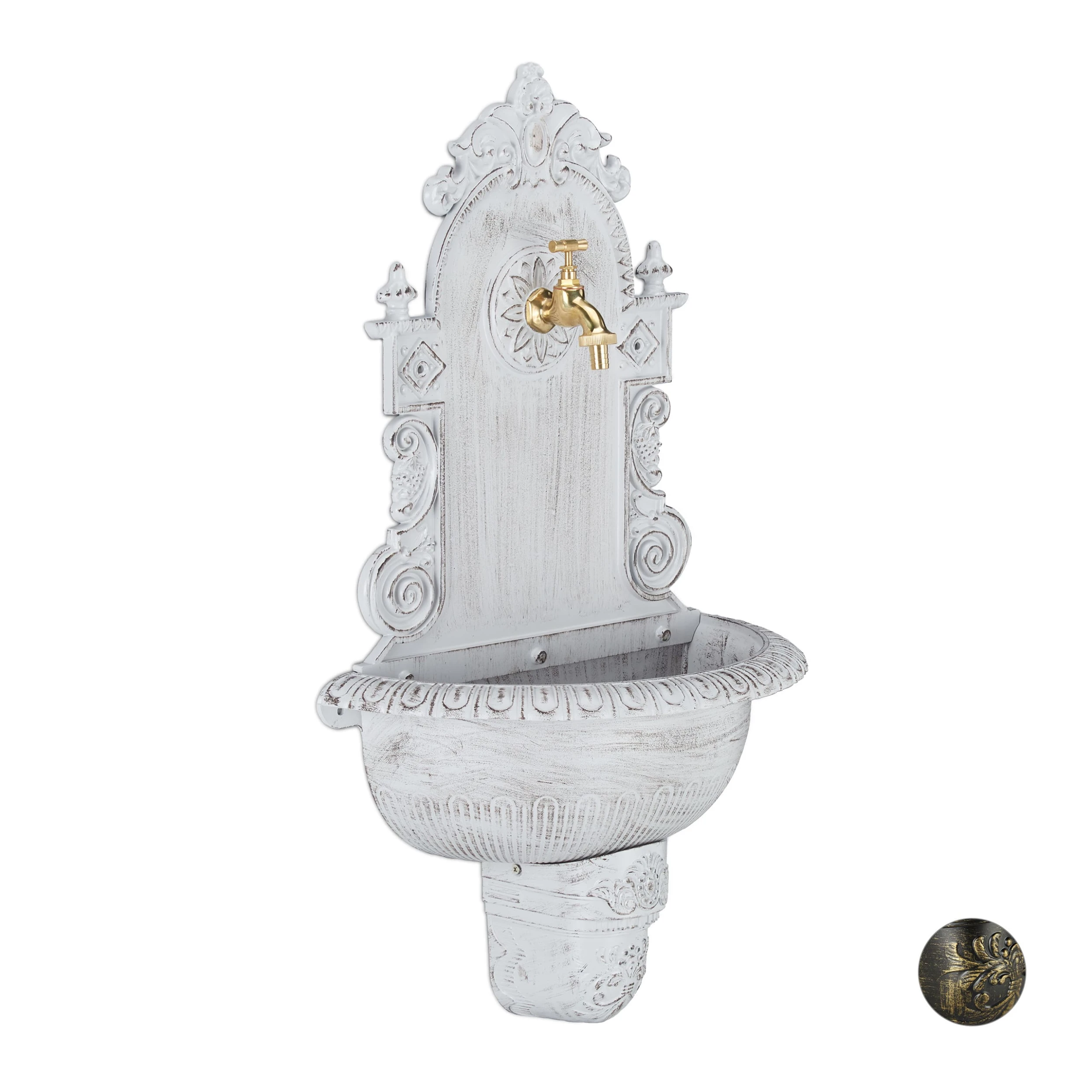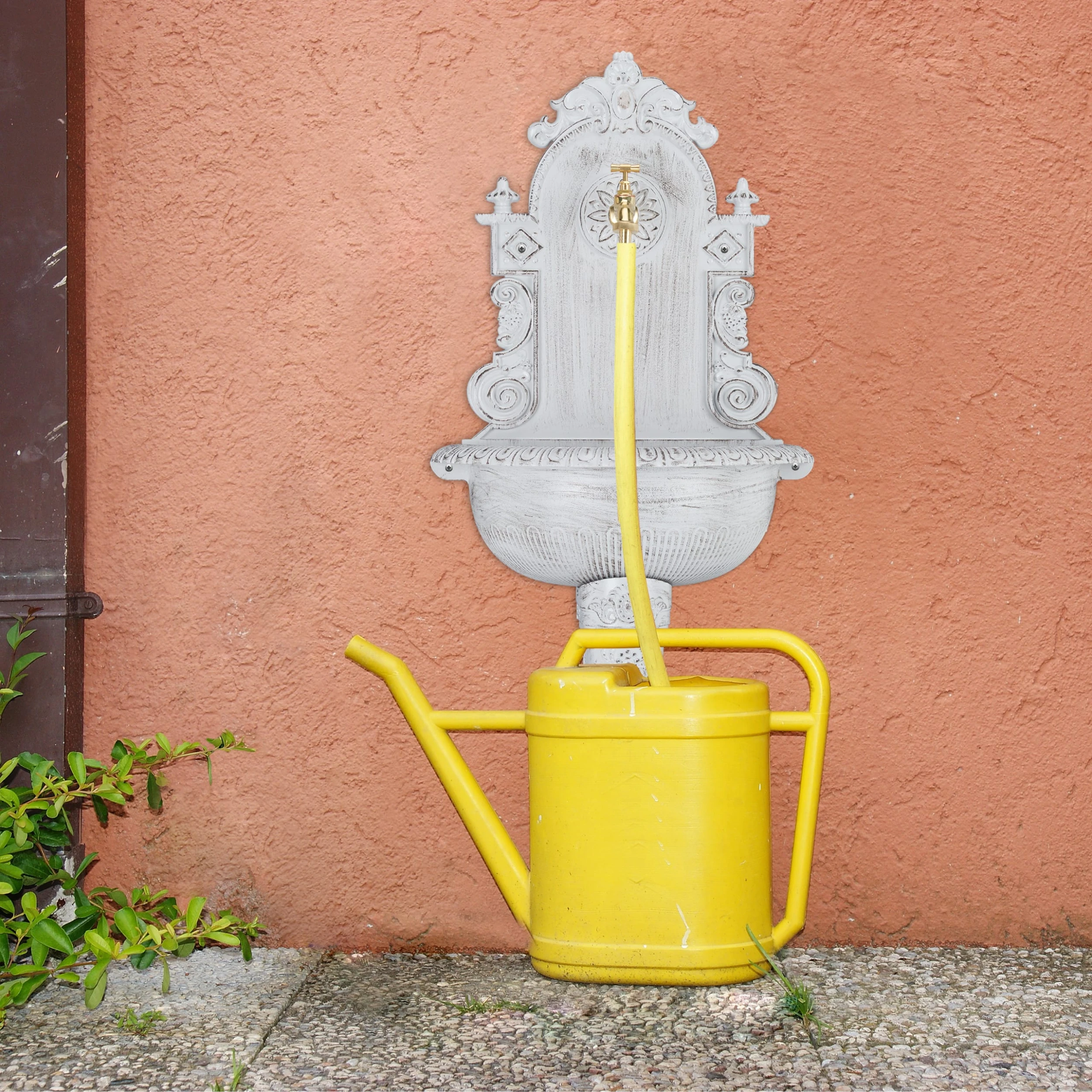 Der Wandbrunnen setzt mit seiner antiken Optik interessante Akzente auf der Terrasse oder im Garten. Mit dem Aussenhahn können Sie in das Waschbecken Wasser einlassen, dessen Abfluss sich mit dem Stöpsel verschließen lässt. Ob Sie schmutzige Hände waschen, Gartengeräte reinigen oder Ihre Gießkanne füllen möchten, mit dem Gartenwaschbecken ist alles möglich. Das Wandbecken ist aus pulverbeschichtetem Aluminiumguss gefertigt und damit perfekt geeignet für die Nutzung im Außenbereich.