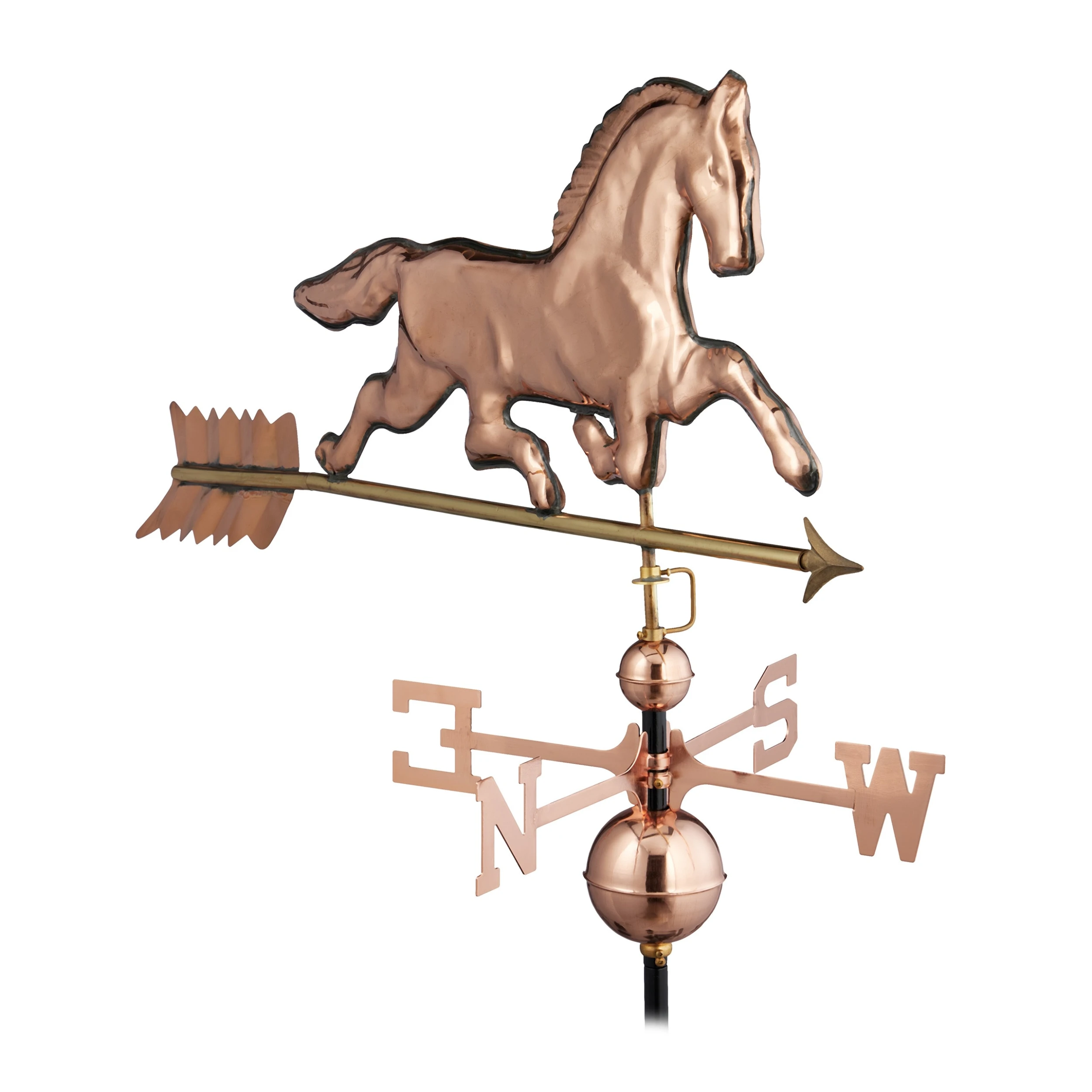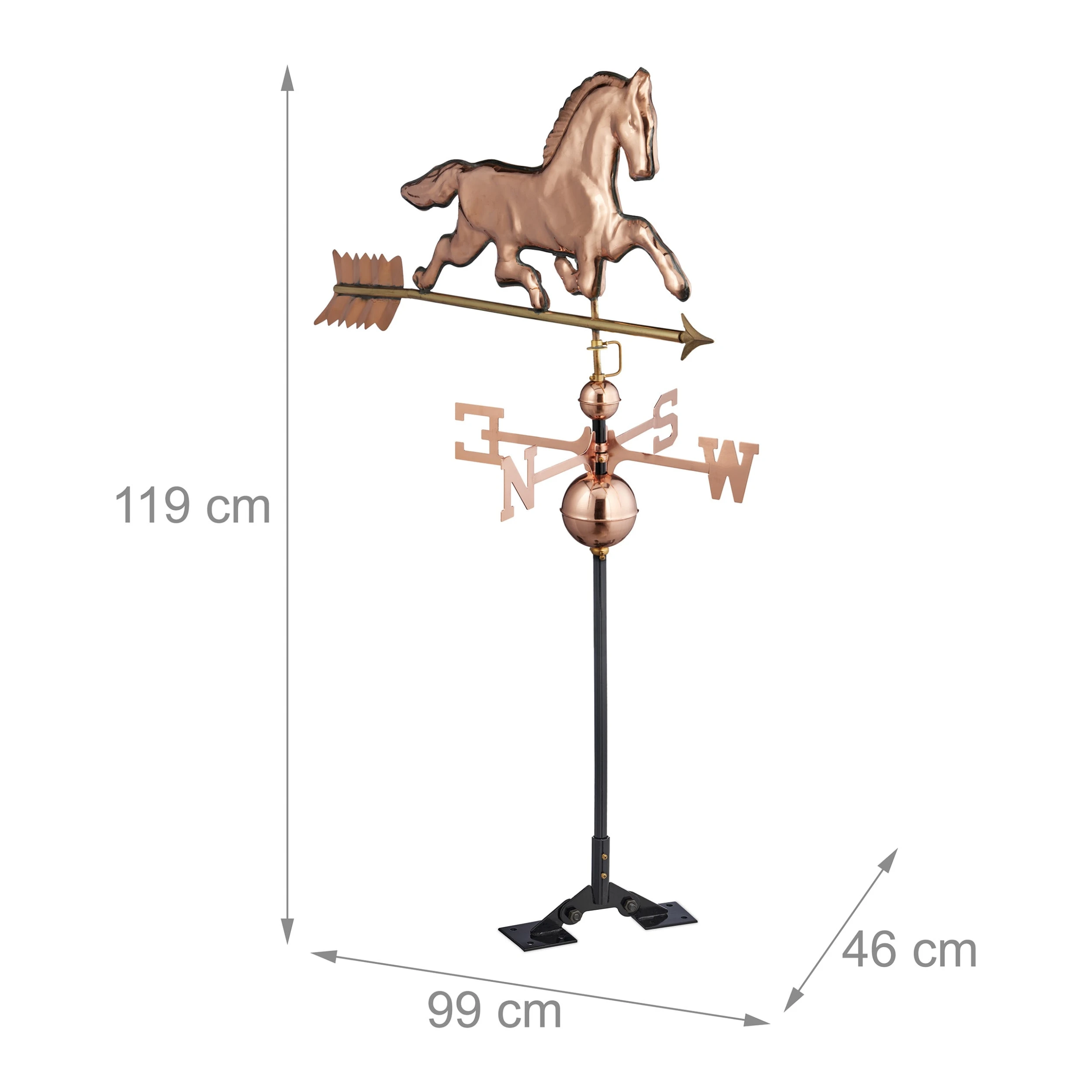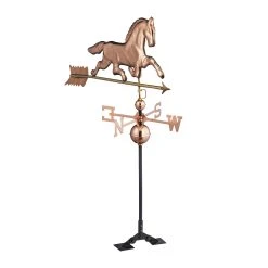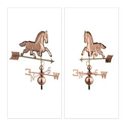 Mit der dekorativen Windfahne in Form eines Pferdes holst Du Dir Deinen ganz eigenen Windrichtungsanzeiger auf das Dach von Haus oder Gartenpavillon. Der Wetterhahn wird entsprechend der 4 Himmelsrichtungen ausgerichtet und kann dank des verstellbaren Fußes auf flachen oder spitzen Dächern montiert werden. Durch auftretenden Wind bewegt sich der Pfeil und zeigt so die korrekte Windrichtung an. Mit ihrem Kupfer-Design ist die Deko-Wetterfahne auch optisch ein toller Blickfang für den Garten.