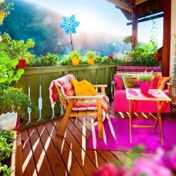 Das frühlingshafte Windrädchen mit Blumenmotiv ist die ideale Dekoration, um karge Balkone, graue Terrassen oder farblose Gärten freundlicher zu gestalten. Einfach ins Beet oder einen Blumentopf gesteckt, ist das Blumen-Design ein echter Hingucker. Genieße das prachtvolle Farbenspiel, wenn das Windrad von wehenden Lüften angetrieben wird. An dem Windspiel können sich Kinder und Erwachsene gleichermaßen erfreuen. Nimm die Windmühle auch mit zum Camping oder an den Strand.