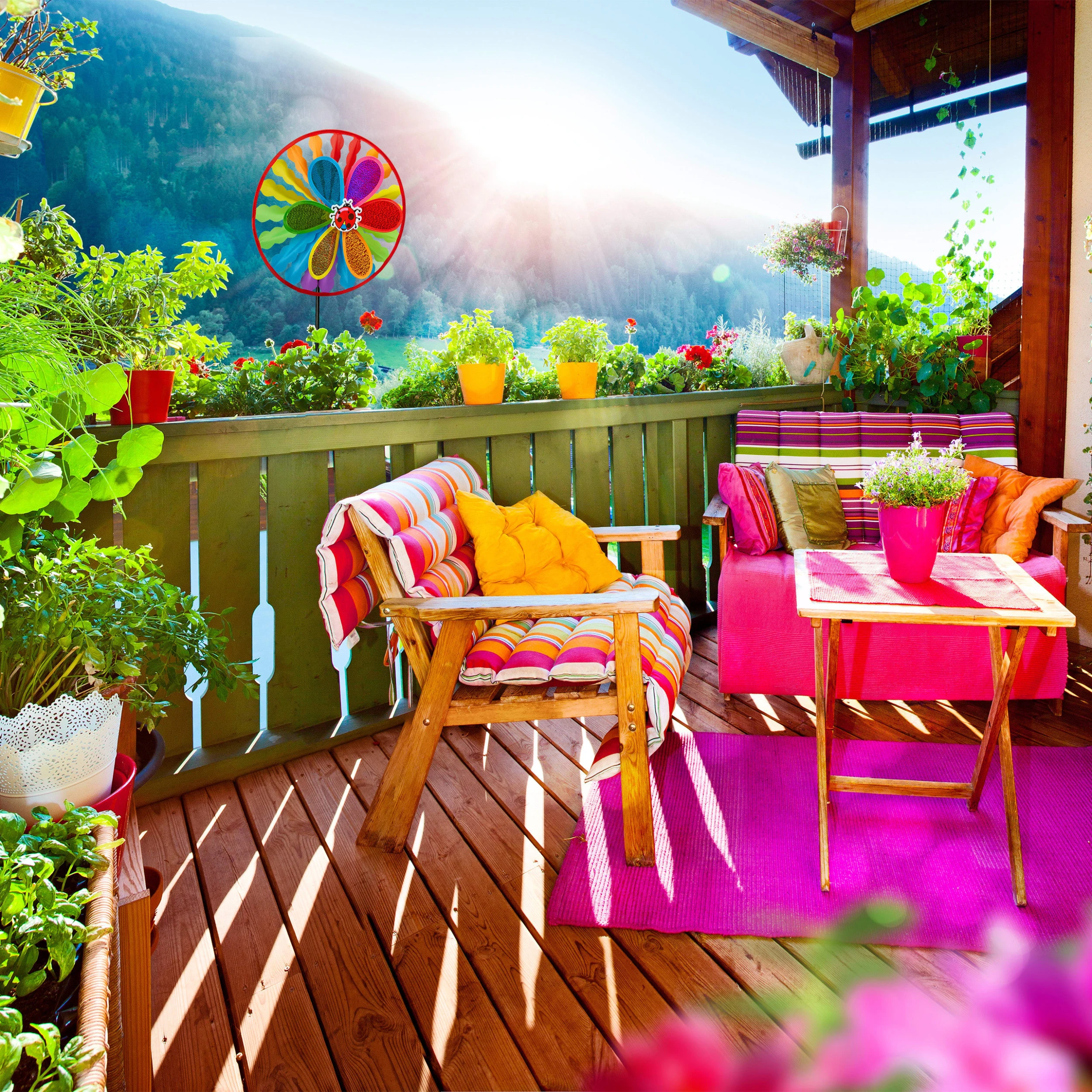Dieser frühlingshafte Gartenstecker ist die ideale Deko, um Balkone, Terrassen oder Gärten freundlicher zu gestalten. Ins Beet oder einen Blumentopf gesteckt, ist das bunte Blumen Design ein echter Hingucker. Genießen Sie das prachtvolle Farbenspiel, wenn das Windrad von wehenden Lüften angetrieben wird. Oder Sie lenken damit Vögel von Ihrem Grundstück weg. An dem Windspiel können sich Kinder und Erwachsene gleichermaßen erfreuen. Nehmen Sie die Windmühle auch mit zum Camping oder an den Strand.