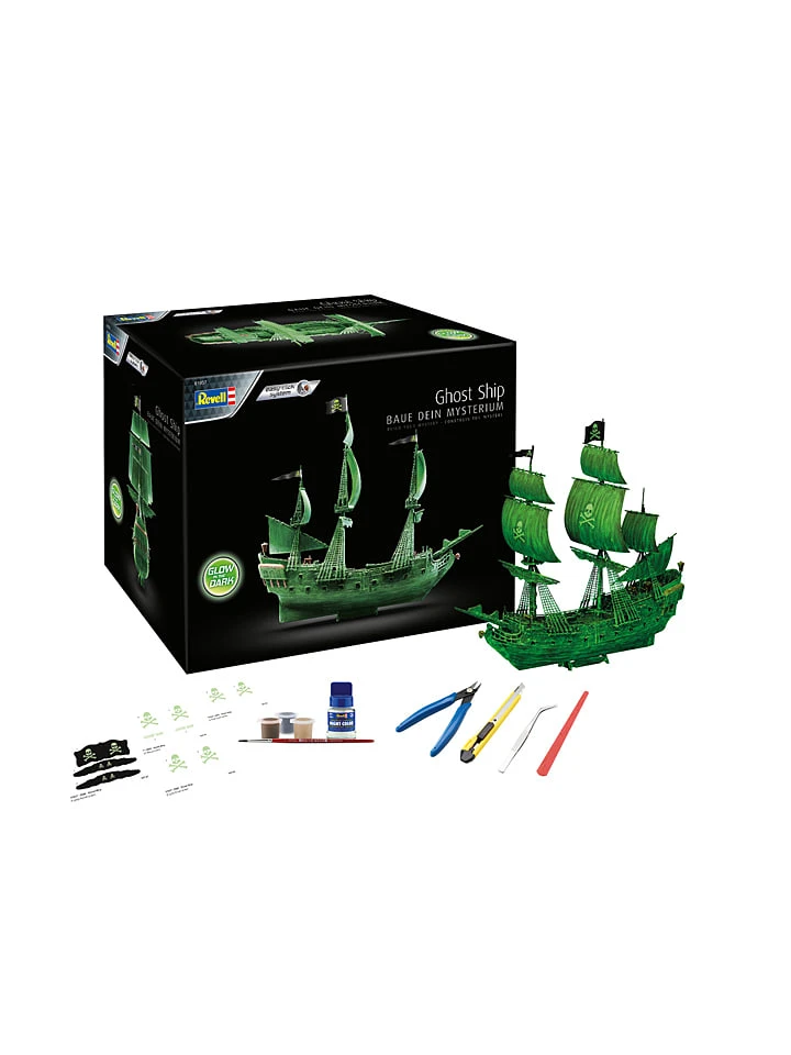 In 24 Tagen zum eigenen fertig-gebauten mysteriösen Geisterschiff. Mehrfarbige Teile. Kein Kleben. Inklusive Werkzeug und Zubehör für den Bau deines Traummodells. Echte Piraten bauen ihre Schiffe selbst! Stell dich der Herausforderung und baue mit dem Revell Adventskalender in 24 Tagen dein Traumschiff. Alles was du dazu benötigst ist enthalten und Weihnachten kannst du dann dein selbstgebautes Modell stolz in den Händen halten. Dieses Schiff erwacht erst bei Dunkelheit zum Leben. Das Ghost Ship verbreitet Angst und Schrecken wenn es im Dunkeln leuchtet. Mythen ranken sich um dieses Schiff. Den Leuchteffekt kriegst du Dank besonderer Farbe ganz einfach hin. Alles nötige ist in den 24 Türchen enthalten. Durch das innovative easy-click-system ist bei diesem Modell schneller Erfolg garantiert: Mehrfarbige, präzise gefertigte Bauteile werden durch einfaches Zusammenstecken stabil verbunden und mit Stickern dekoriert.