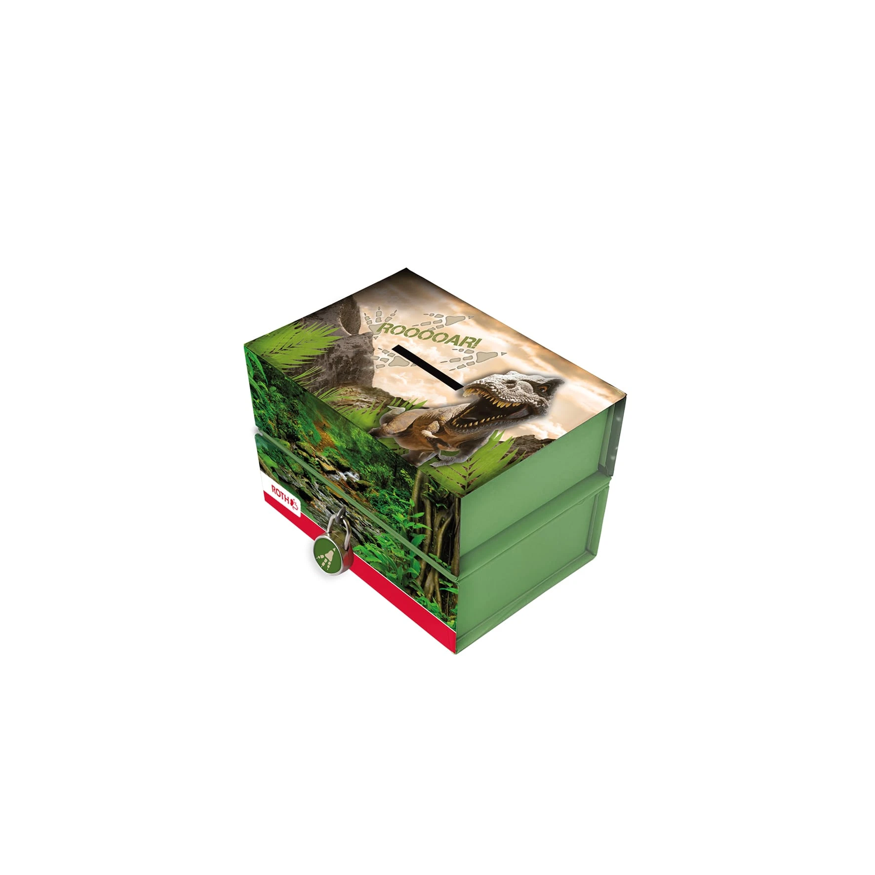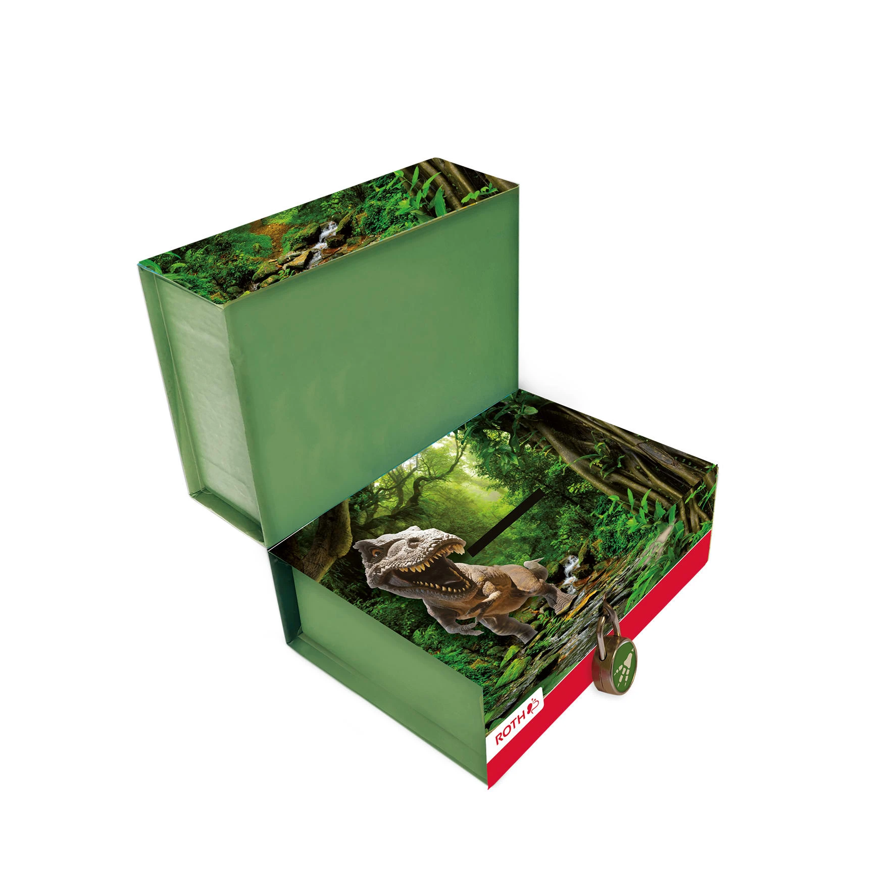 Spardose mit 2 getrennten Boxen für kurz- und langfristige Sparziele. Die obere Box ist durch ein Magnet und die untere Box durch ein Vorhängeschloss gesichert. Pappsparbox mit unterteilten Fächern für Taschengeld. Das coole Design passt zu unserer Roth-Schultütenserie. Wunderschön – Der kraftvolle T-Rex strahlt auf dieser in Grün und Schwarz gehaltenen Dino Geldbüchse. Daneben ranken Blätter schön um den Saurier TRex aus der Urzeit.