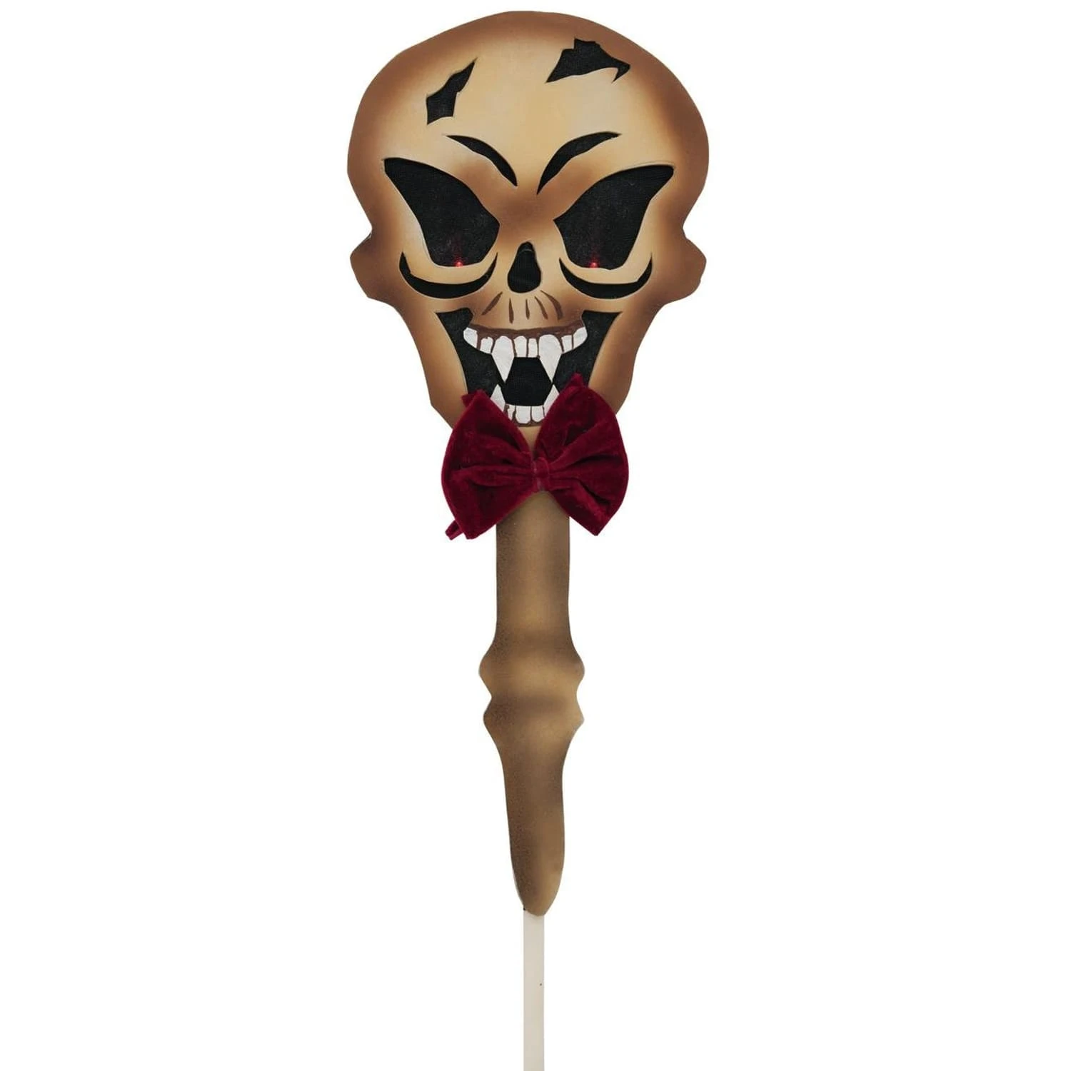 Halloween Bodenstecker Totenkopf – rot leuchtende Augen – 87cm Dieser wetterfeste Gartenstecker ist perfekt für Deinen Vorgarten, einen Blumentopf oder den Balkon geeignet. In den Augen sind 2 rot leuchtende LED verbaut die nachts eine gruselige Stimmung machen.