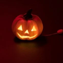 Halloween Dekokürbis beleuchtet – LED – 12cm Diese leuchtende Halloweendekoration zeigt allen Passanten, dass in dem Haus Halloweenfans leben. Der Kürbis mit einen lustigen Gesicht hat im Innern eine LED eingebaut, die den Kürbis nachts schön leuchten lässt.