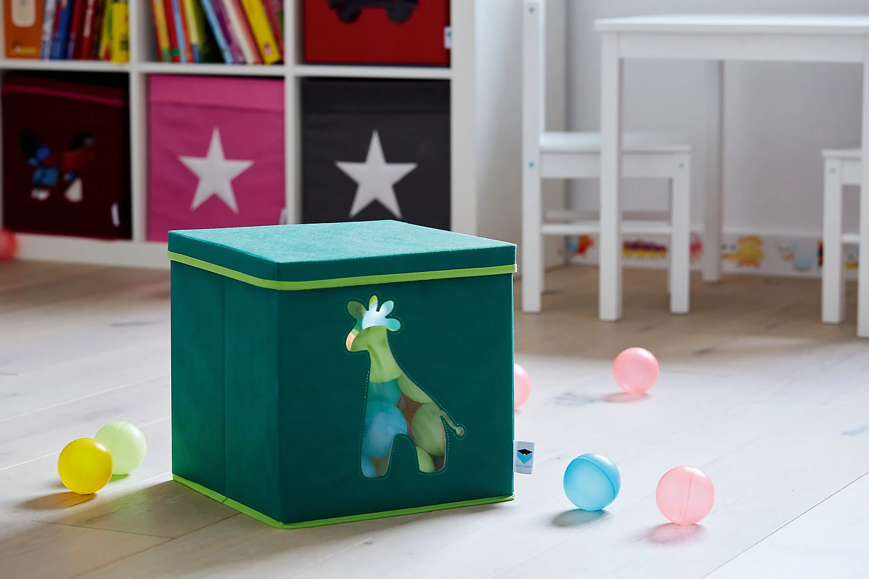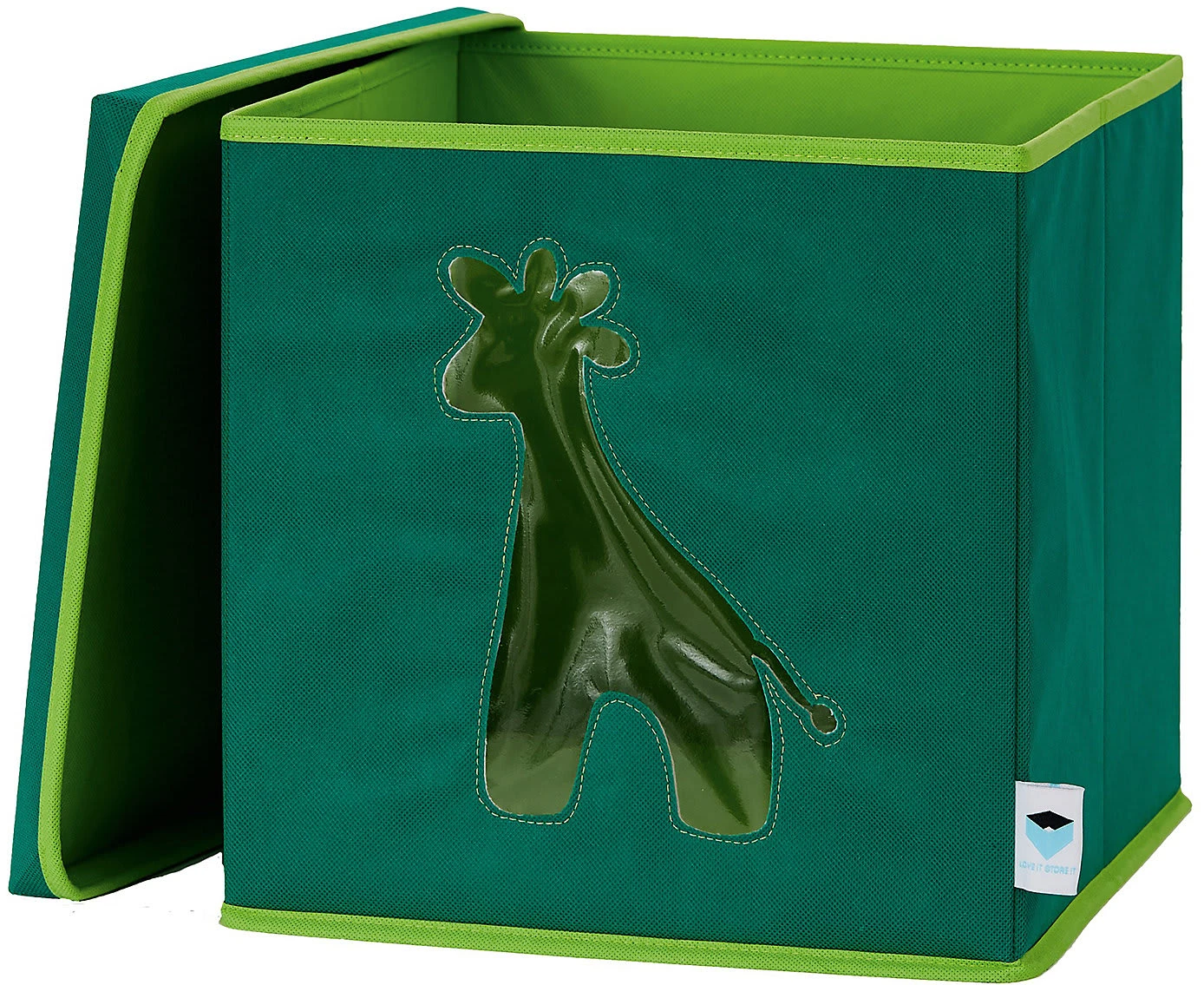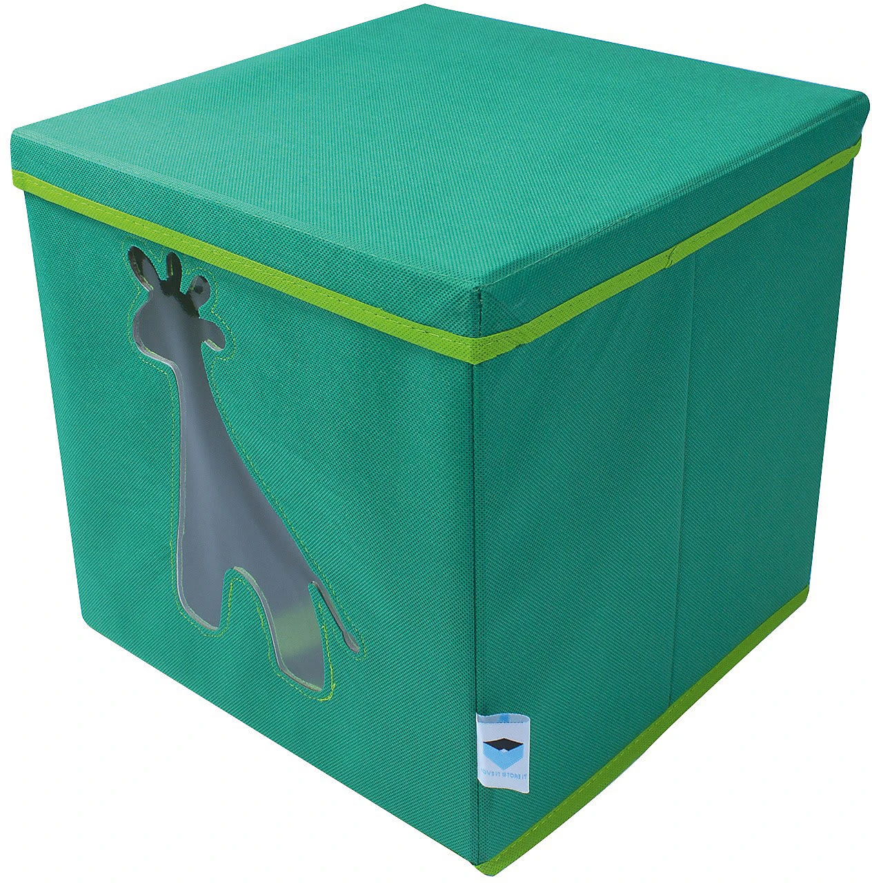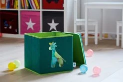 Diese schöne Spielzeugkiste mit tollem Giraffen Motiv, bringt Farbe in das Kinderzimmer. Sie bietet viel Stauraum für Spielsachen oder andere schöne Dinge. Besonders praktisch ist das Sichtfenster. Ohne alle Boxen aus dem Regal holen zu müssen, hat man immer den Inhalt der Box im Blick. Die robuste Folie im Sichtfenster verhindert, dass das Spielzeug herausfallen kann. Mit dem Deckel kann die Aufbewahrungsbox geschlossen werden, wodurch sie sich wunderbar stapeln lässt und der Inhalt bleibt staubfrei. Die Kanten sind nicht scharf und somit für zarte Kinderhände geeignet.
