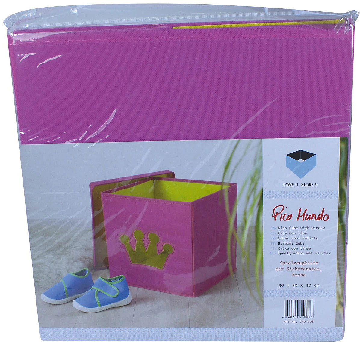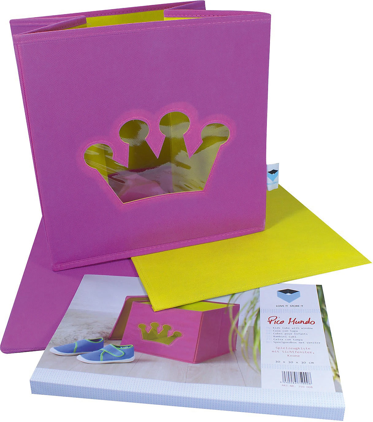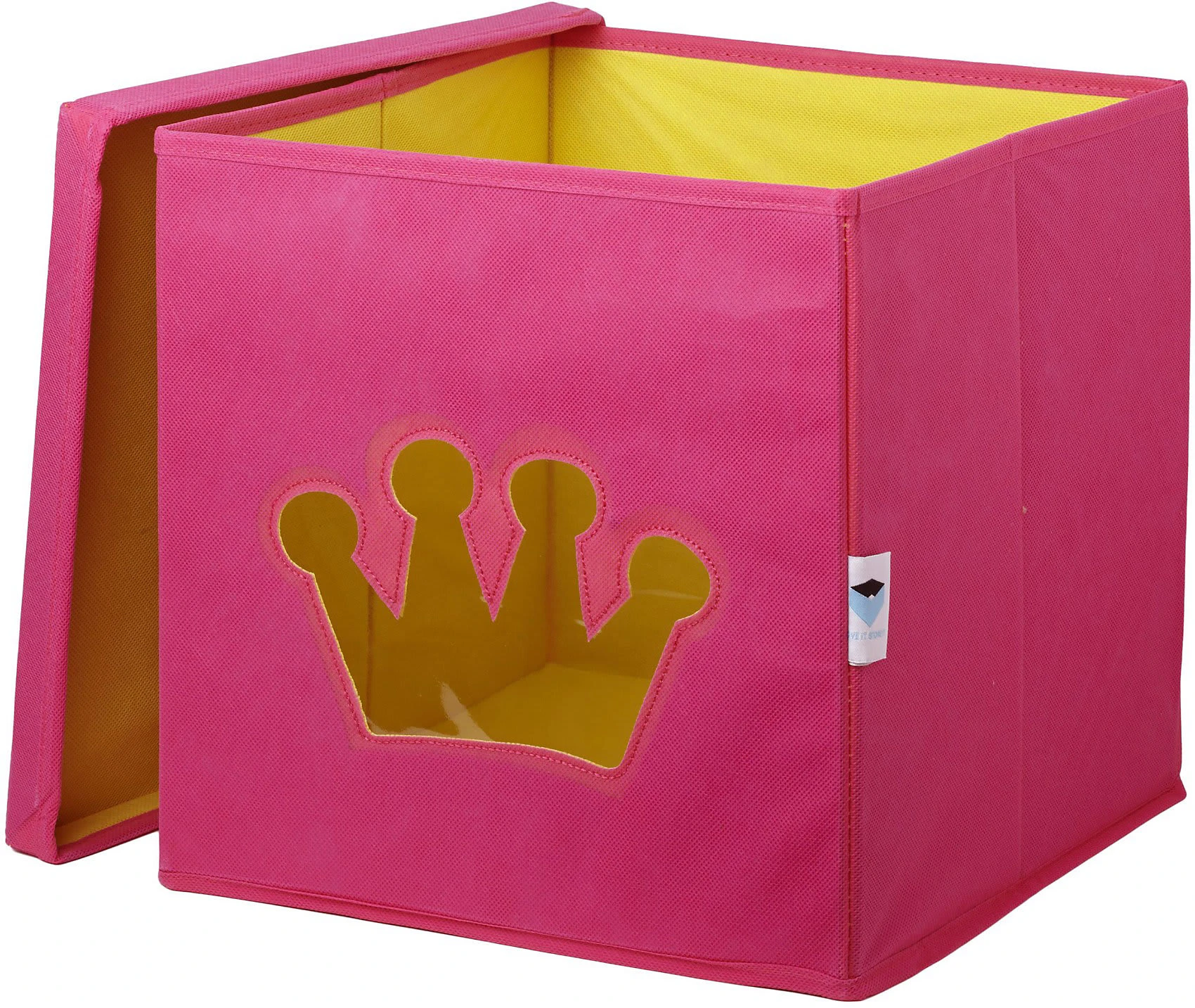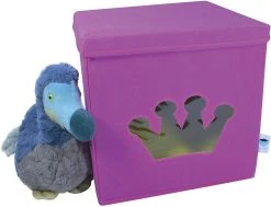 Diese schöne Spielzeugkiste, im tollen Kronen Design, bringt Farbe in das Kinderzimmer. Sie bietet viel Stauraum für Spielsachen oder andere schöne Dinge. Besonders praktisch ist das Sichtfenster. Ohne alle Boxen aus dem Regal holen zu müssen, hat man immer den Inhalt der Box im Blick. Die robuste Folie im Sichtfenster verhindert, dass das Spielzeug herausfallen kann. Mit dem Deckel kann die Aufbewahrungsbox geschlossen werden, wodurch sie sich wunderbar stapeln lässt und der Inhalt bleibt staubfrei. Die Kanten sind nicht scharf und somit für zarte Kinderhände geeignet.