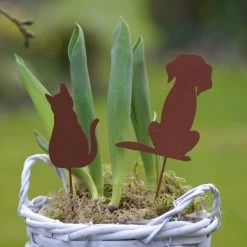 Der Hund und die Katze bestehen aus robustem und hochwertigen Metall mit einer einzigartigen Rostoptik. Die Roststecker sind witterungsfest und frostfest. Sie können sie das ganze Jahr über draußen stehen lassen. Die Gartenstecker eignen sich auch hervorragend als außergewöhnliches und kreatives Geschenk für Gartenfreunde und Dekofans! Die Pflanzenstecker werden mit fixierten Stäben geliefert und lassen sich ganz bequem und unkompliziert aufstellen. Die Roststecker werden zum Hingucker in Ihrem Garten und ziehen die Blicke Ihrer Nachbarn auf sich.