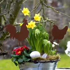 Die Hühner bestehen aus robustem und hochwertigen Metall mit einer einzigartigen Rostoptik. Die Roststecker sind witterungsfest und frostfest. Sie können sie das ganze Jahr über draußen stehen lassen. Die Gartenstecker eignen sich auch hervorragend als außergewöhnliches und kreatives Geschenk für Gartenfreunde und Dekofans! Die Pflanzenstecker werden mit fixierten Stäben geliefert und lassen sich ganz bequem und unkompliziert aufstellen. Die Roststecker werden zum Hingucker in Ihrem Garten und ziehen die Blicke Ihrer Nachbarn auf sich.