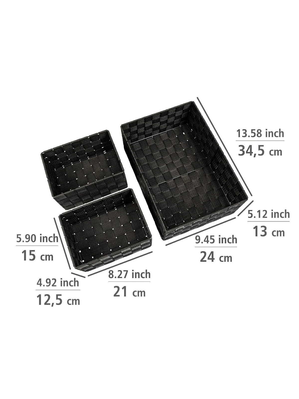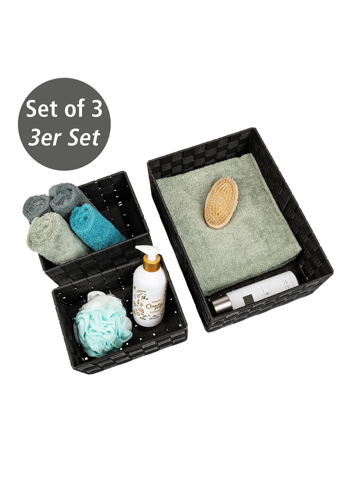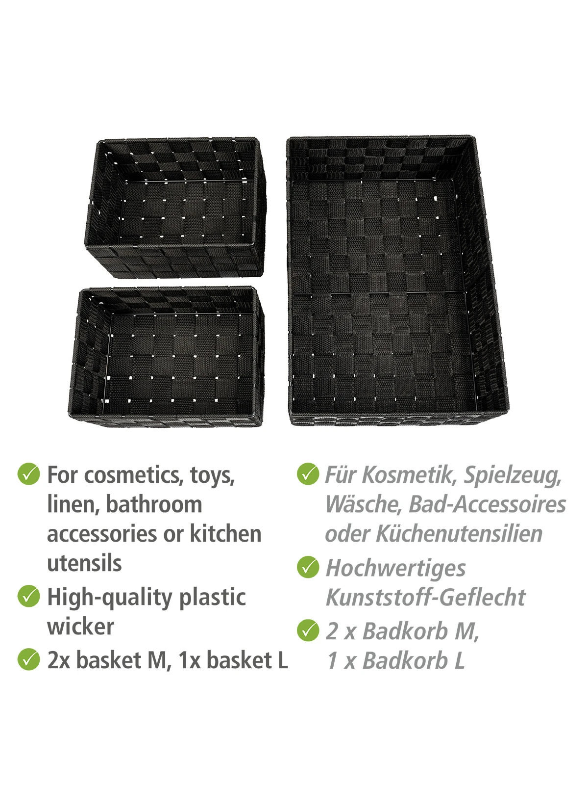Ein Korb für alle Fälle – Das anspruchsvolle Set Badkorb Adria von WENKO besteht aus 3 stilvollen, schwarzen Aufbewahrungskörben in 2 verschiedenen Größen. Dank der unterschiedlichen Ausführungen können Sie die formschönen Körbe ganz nach Belieben, individuell einsetzen.