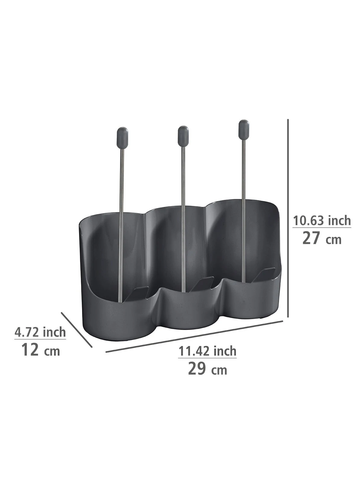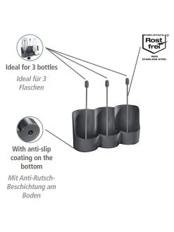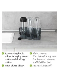 Machen Sie sich das Leben leichter mit dem praktischen Flaschenhalter von WENKO. Die schwarze Flaschenhalterung aus robustem ABS-Kunststoff bewahrt Wasserflaschen und viele andere Getränkeflaschen geordnet und sicher während des Trocknens auf. Ein Must-Have für jede gut organisierte Küche. Der praktische Alltagshelfer mit Anti-Rutsch-Beschichtung am Boden hat einen rutschfesten Stand auf der Spüle sowie der Arbeitsplatte. Die Haltevorrichtung für 3 Deckel sorgt dafür, dass diese nicht verloren gehen.