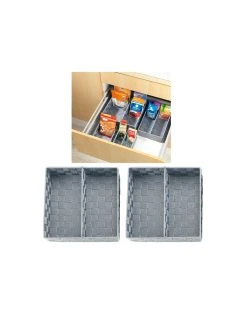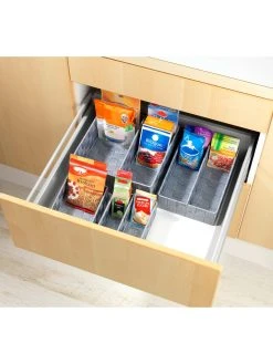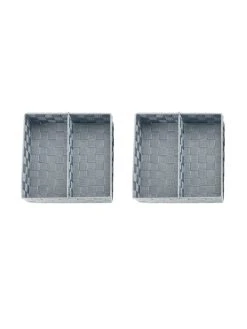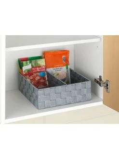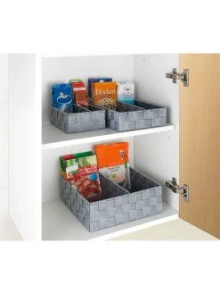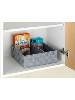 Der praktische Küchen-Organizer Adria L macht Ordnungsproblemen ein Ende. Der clevere Helfer aus hochwertigem, grauem Kunststoff-Geflecht bietet in zwei Abteilungen genügend Platz für Back- und Kochzutaten.