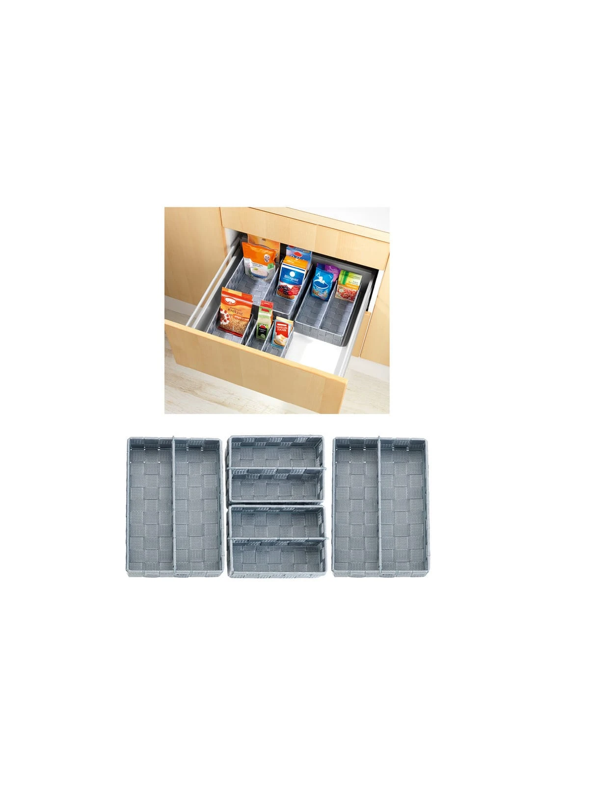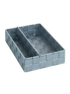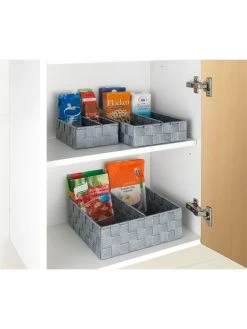 Im Lieferumfang sind zwei Küchen-Organizer der Größe S (13 x 6 x 18 cm) und zwei Körbe der Größe M (18 x 6 cm x 26 cm) enthalten. Die praktische Küchen-Organizer Adria bereiten Ordnungsproblemen ein Ende. Die cleveren Helfer aus hochwertigem, grauem Kunststoff-Geflecht bieten in je zwei Abteilungen genügend Platz für Back- und Kochzutaten.