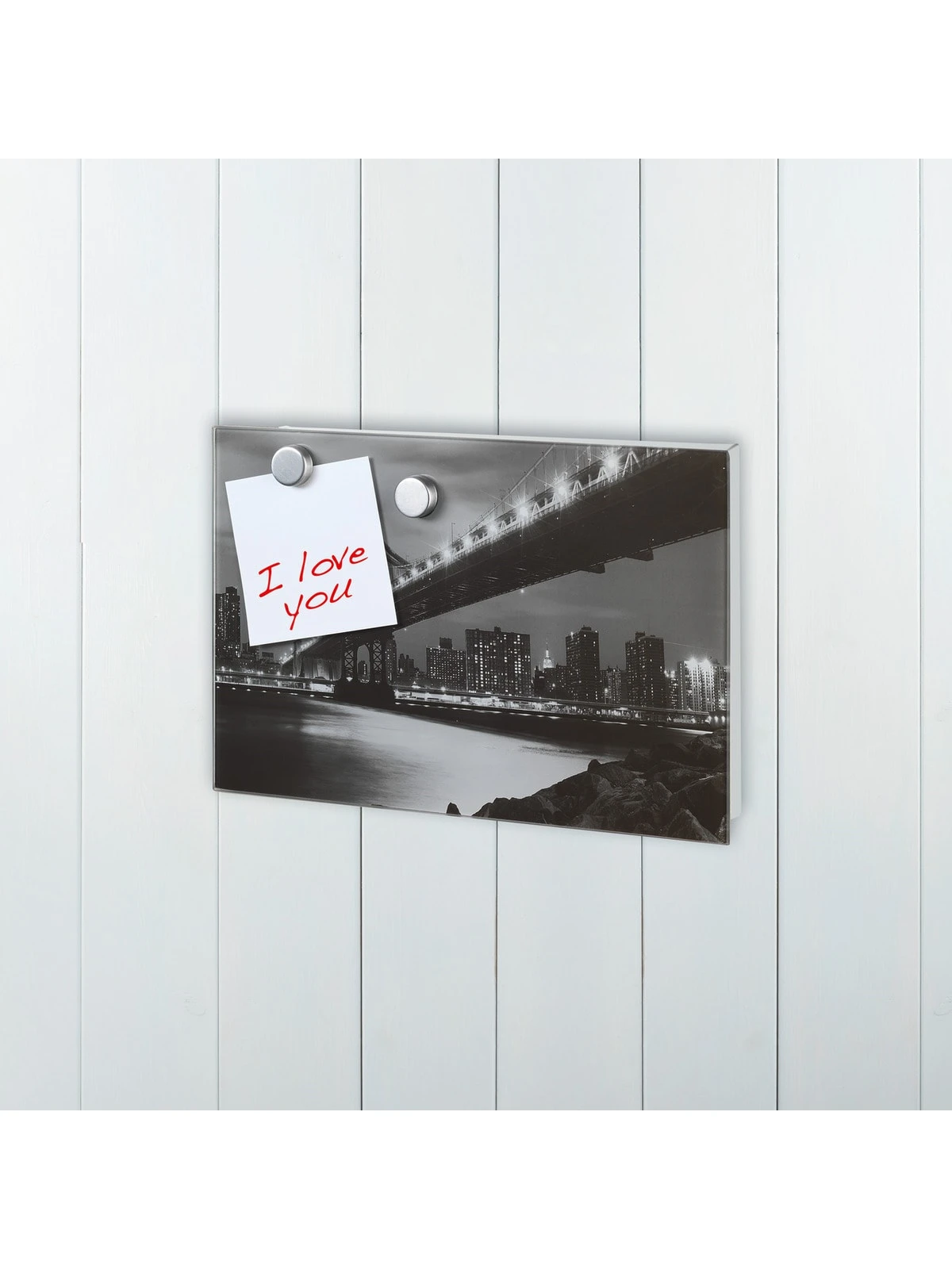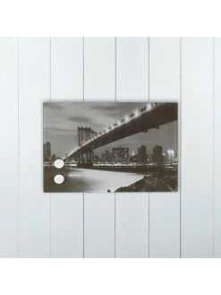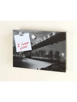 Das Highlight: Das ausgefallene Glasbild kann gleichzeitig als Memoboard verwendet werden. Durch zwei mitgelieferte Magnete können hier gut sichtbar wichtige Notizen und Informationszettel platziert werden. So erinnert das innovative Schlüsselbrett an Termine, Einkäufe, etc. jedes Mal, wenn man es nutzt. Und das stilechte Glasbild der Manhattan Bridge verleiht Ihrem Flur eine individuelle Note.