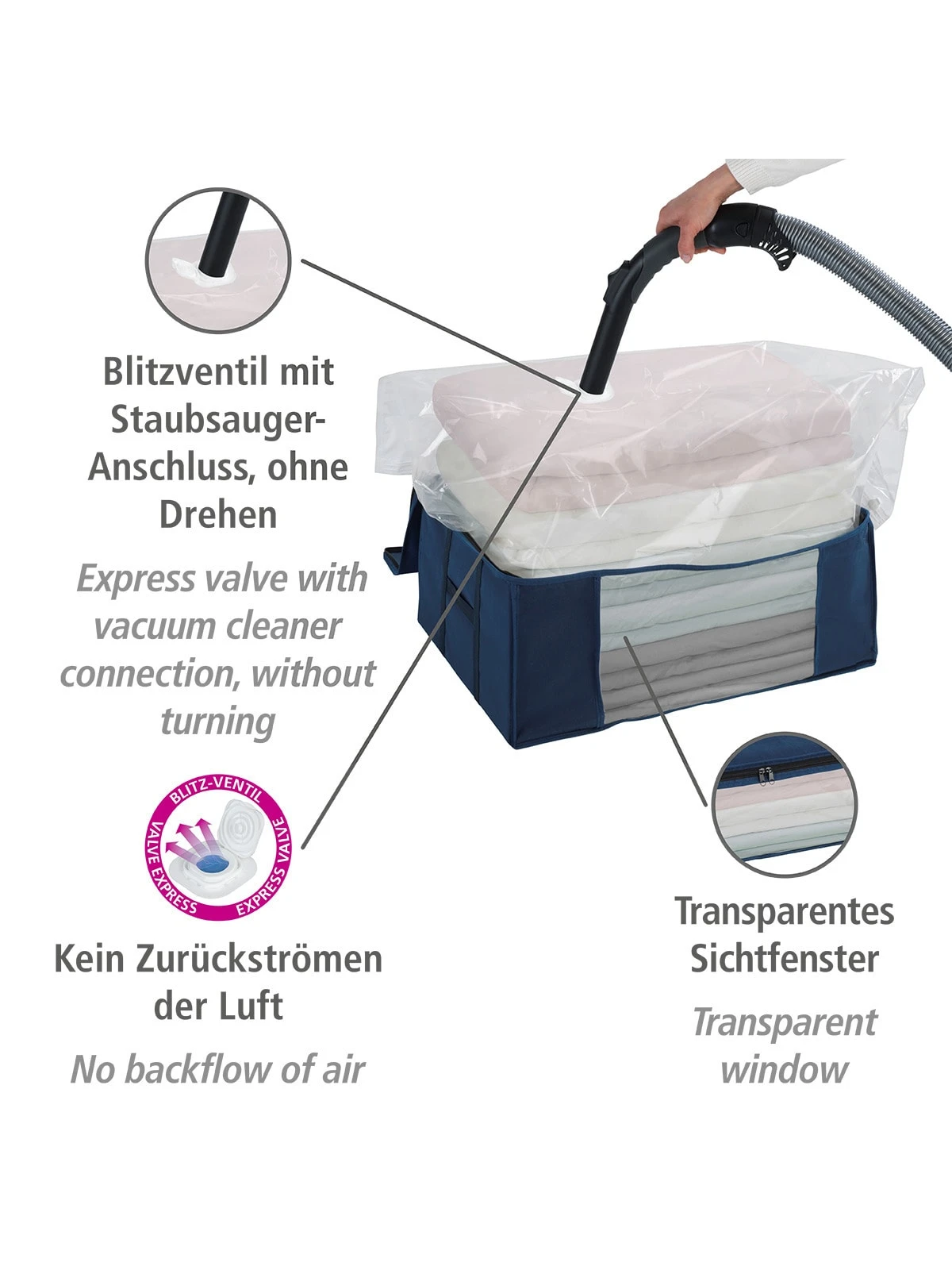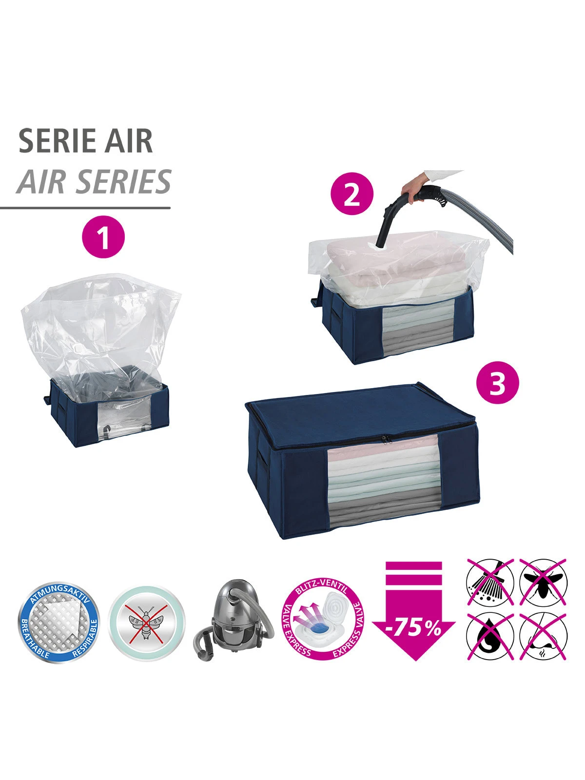 – Vakuum wird mit dem Staubsauger erzeugt und dadurch bis zu 75% Platz gespart