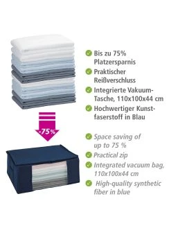Das Luftventil verhindert das Eindringen von Luft und sorgt somit für langanhaltenden Schutz. Mit der Vakuum Box L kann eine Platzersparnis von bis zu 75 % erzielt werden. So bietet sie die ideale Aufbewahrungsmöglichkeit für Saison-Bekleidung. Das Volumen der Winter- oder Sommersachen wird auf ein Minimum reduziert. Die Kleidung wird faltenfrei aufbewahrt. Staub und Motten werden von der Kleidung fern gehalten.