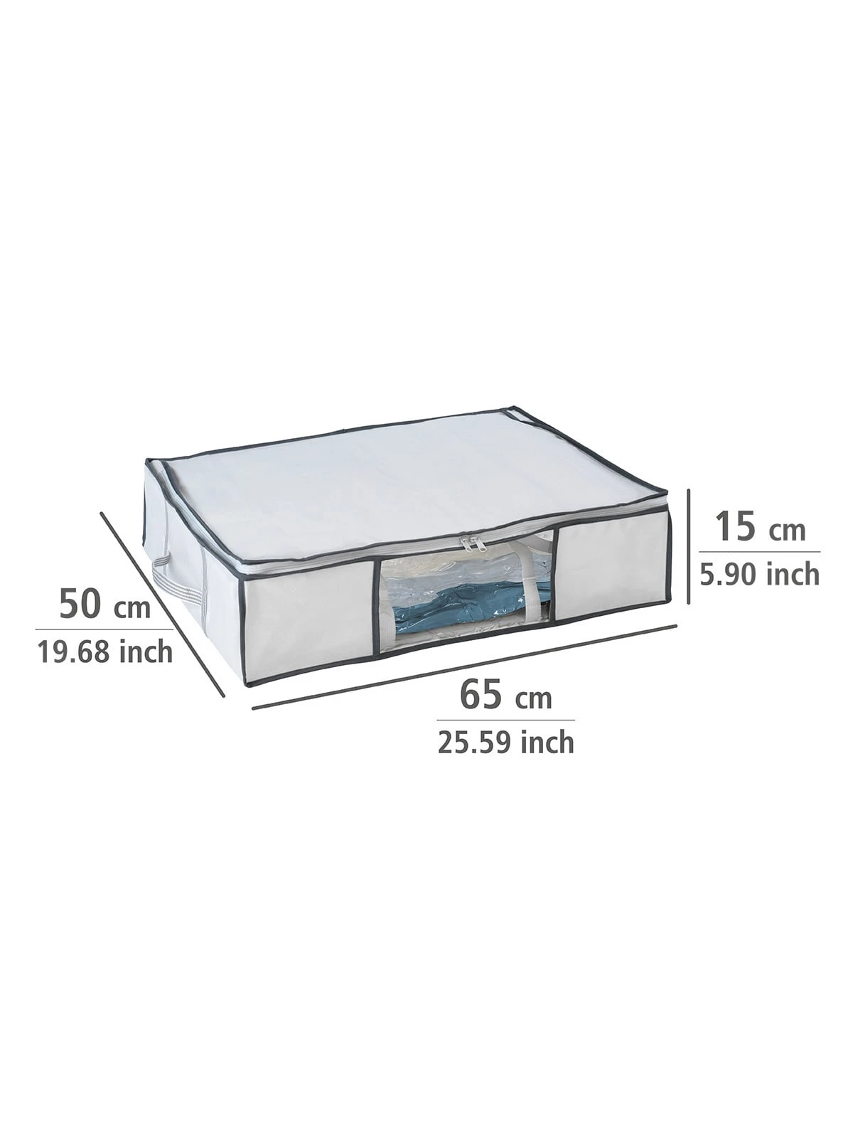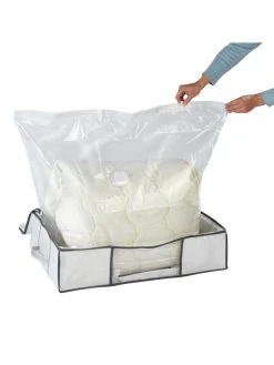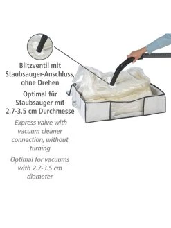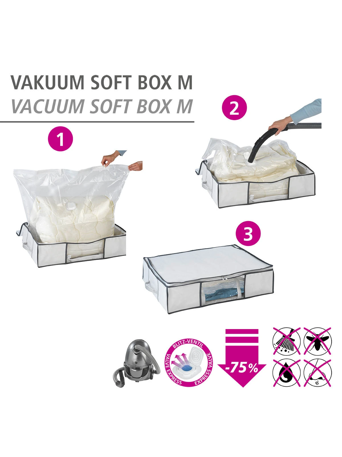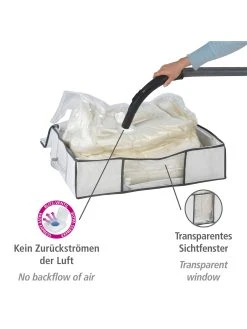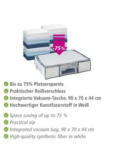 Das Luftventil verhindert das Eindringen von Luft und sorgt somit für langanhaltenden Schutz. Mit der Vakuum Soft Box M kann eine Platzersparnis von bis zu 75 % erzielt werden. Bei Bedarf einfach die Box öffnen und schon sind die Kleidungsstücke wieder verfügbar.