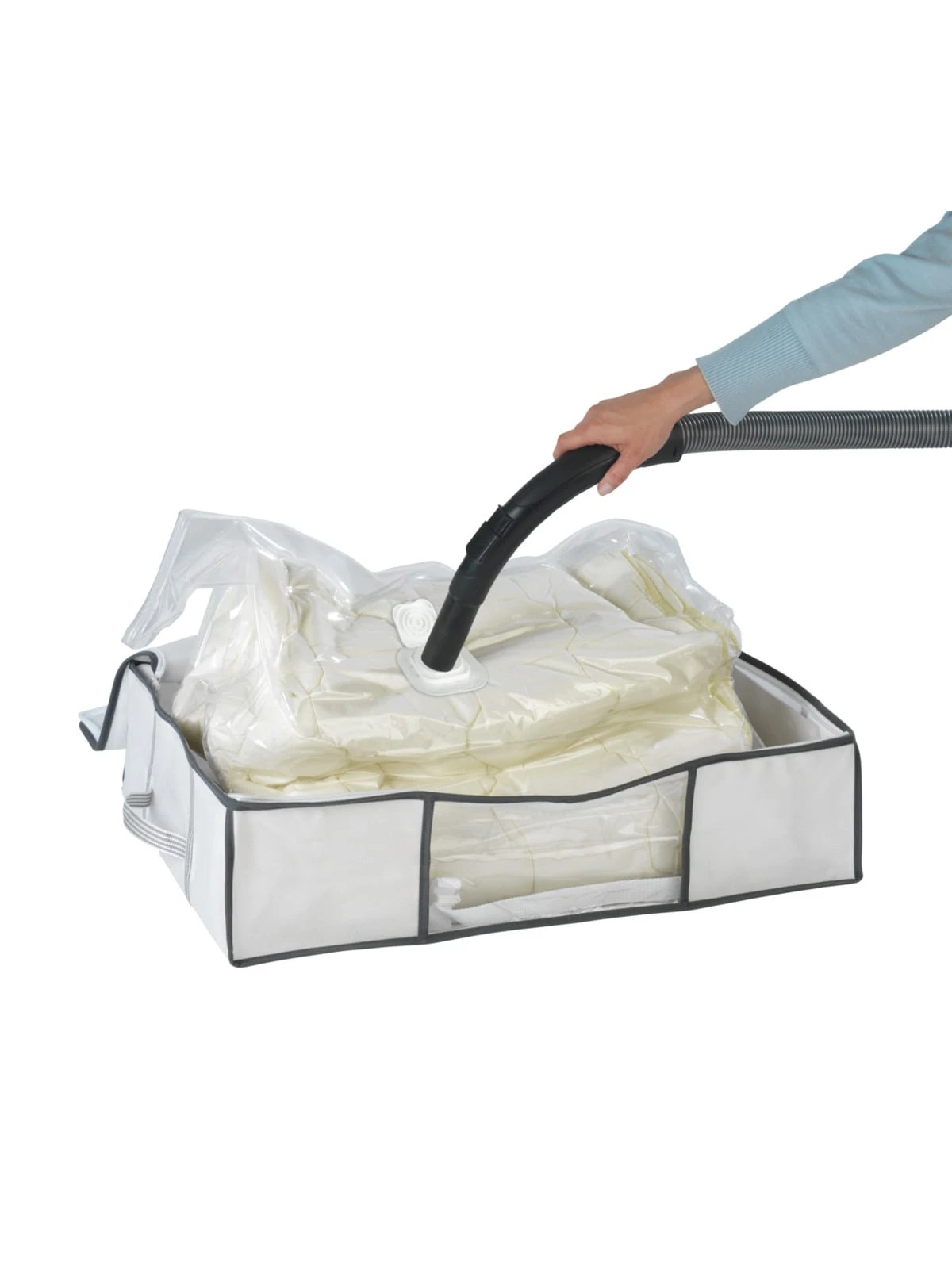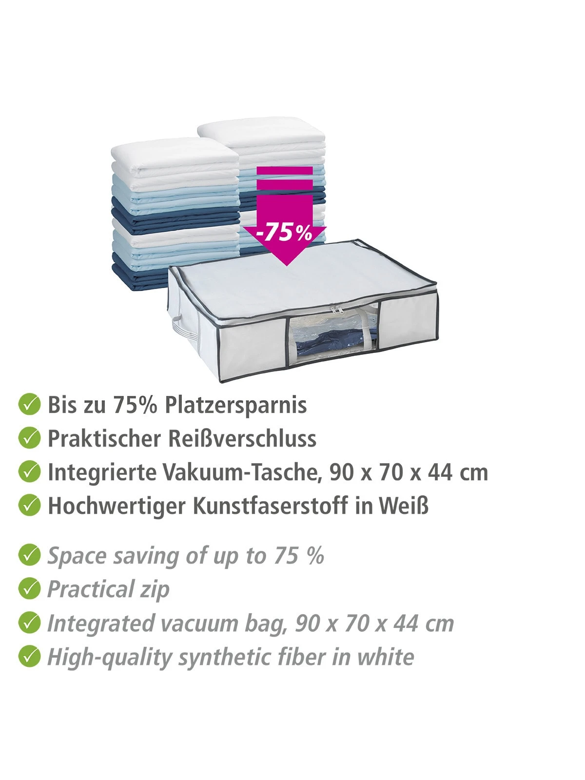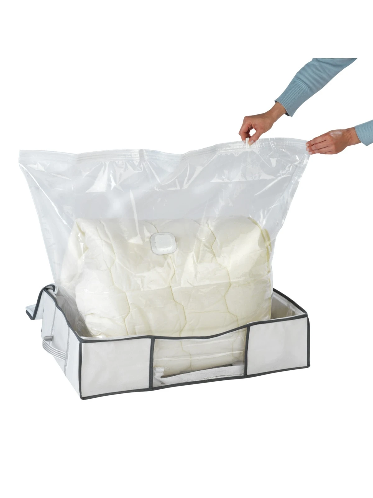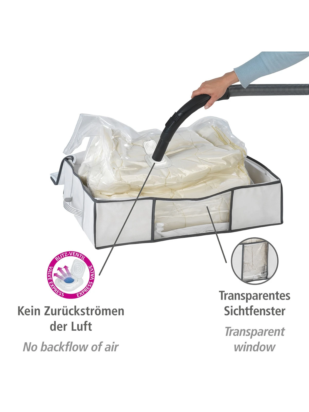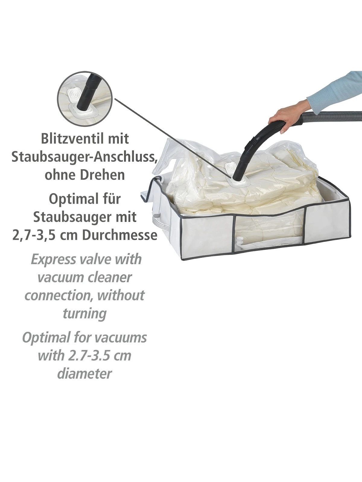 Platzsparen und luftdichtes Verstauen in Einem bietet die Vakuum Soft Box M. In der Box befindet sich eine integrierte Vakuum-Tasche (90 x 70 x 44 cm) mit Blitz-Ventil, welche nach dem Befüllen einfach durch Absaugen geschlossen werden kann.