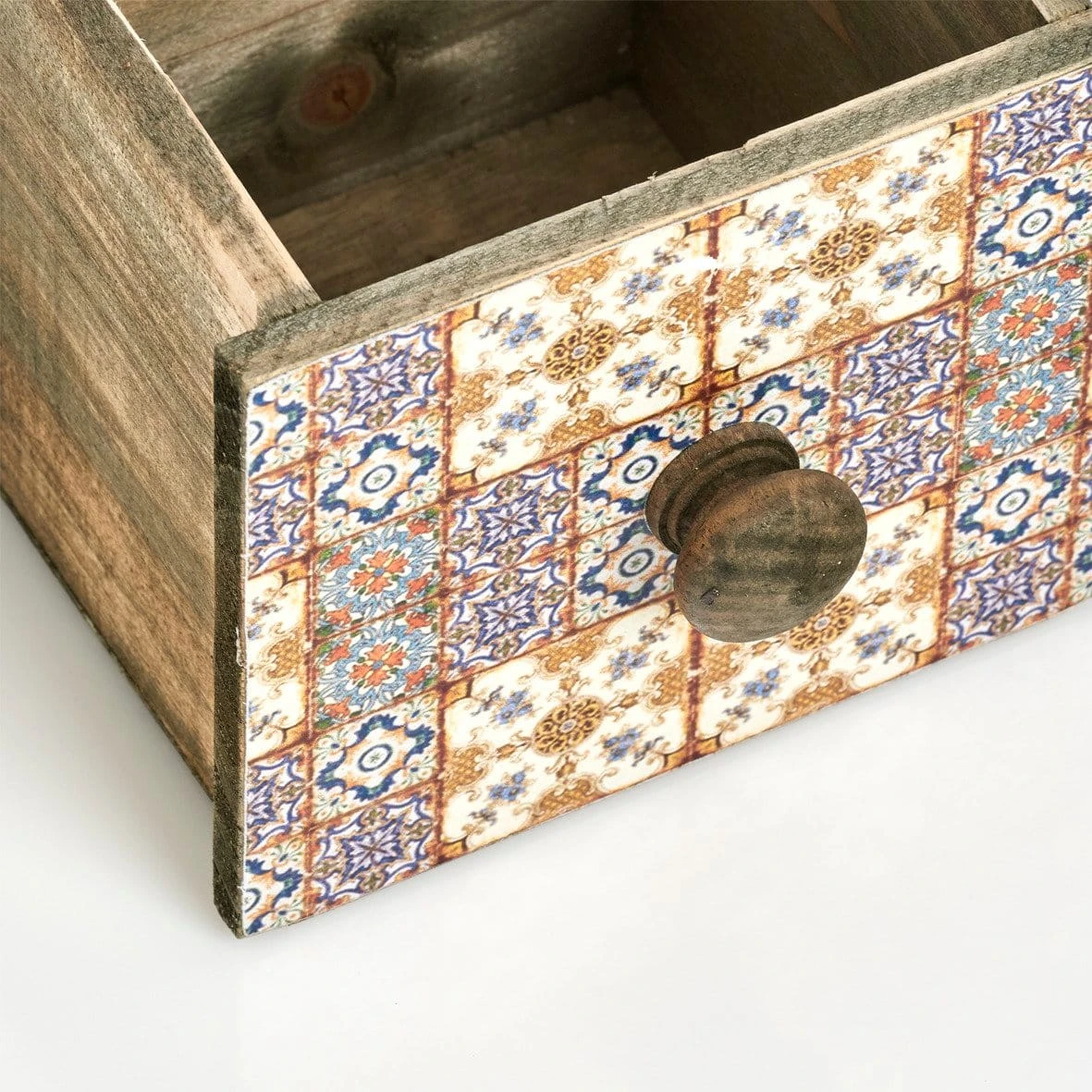 Diese scheinbar einfachen Accessoires können eine wunderbare Dekoration werden. Holz, Alter Stil, und zusätzlich mit komplizierten Muster fertig wird perfekt als Ergänzung zum rustikalen, eklektischen oder Vintage-Stil funktionieren. Überzeugen Sie sich selbst, dass Dekorieren und Organisieren nicht schwierig sein muss! Dekorative Schublade für Utensilien und Blumen MOSAIC ist ein Gegenstand, das in keiner klimatisch dekorierten Küche fehlen kann.
